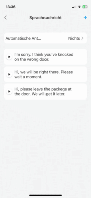 Alternativ könnt ihr auch selbst Antworten im Vorfeld aufzeichnen und abspielen. Das ist alles andere als selbstverständlich und wird beispielsweise vom Branchenprimus Ring nicht unterstützt. Die voraufgezeichneten Antworten können dabei eine Maximallänge von 10 Sekunden haben. Allerdings fiel mir auf, dass die im Vorfeld aufgezeichneten Sprachnachrichten unter einer recht schlechten Audioqualität litten. Verstehen konnte man sie aber dennoch.