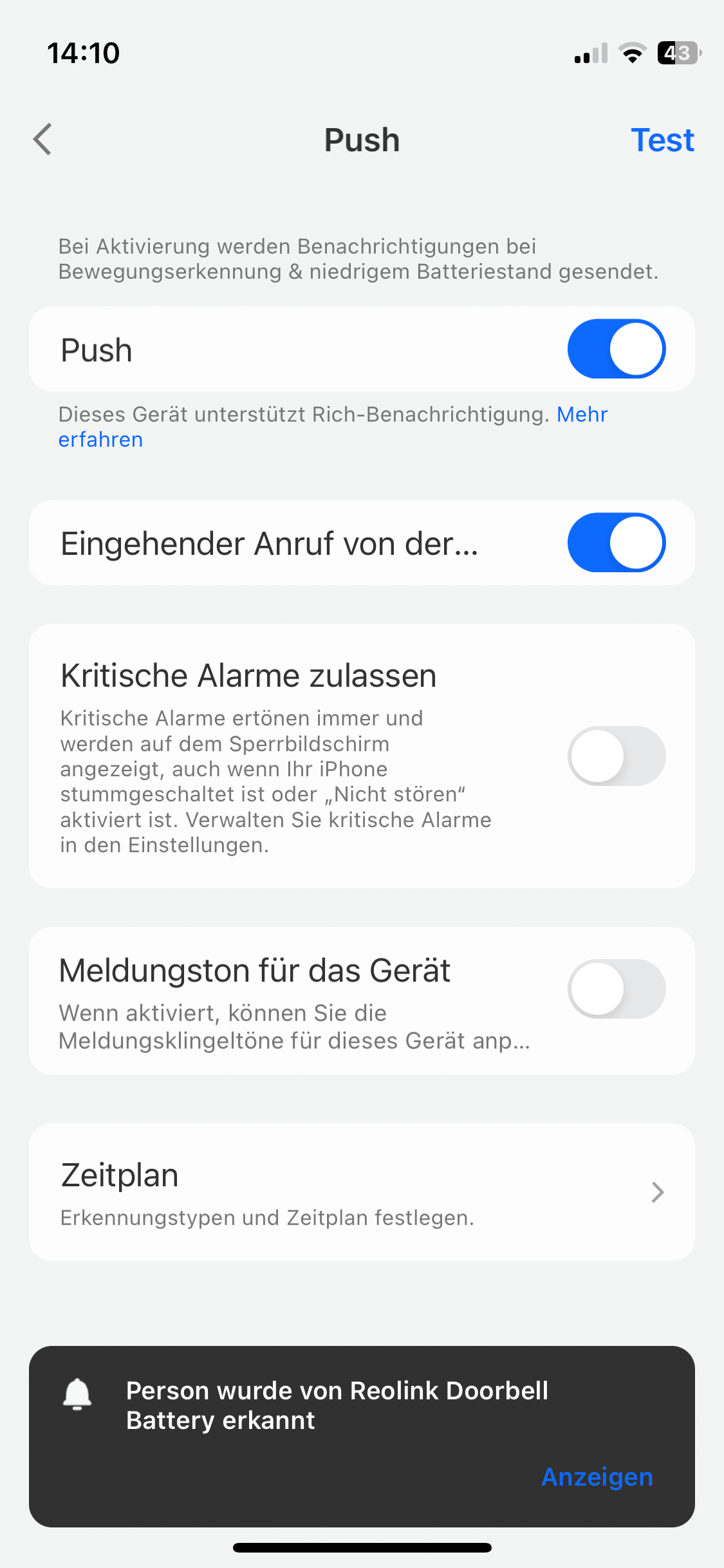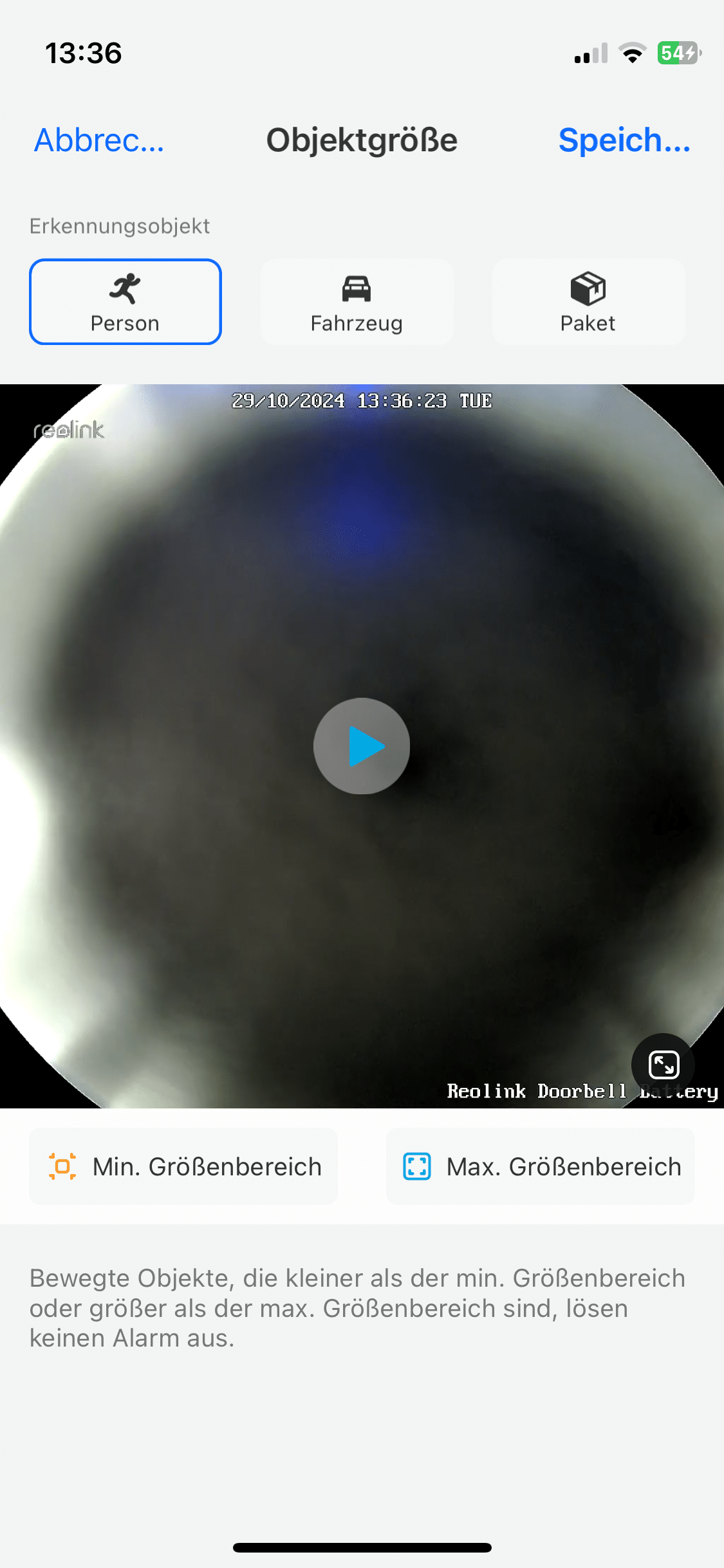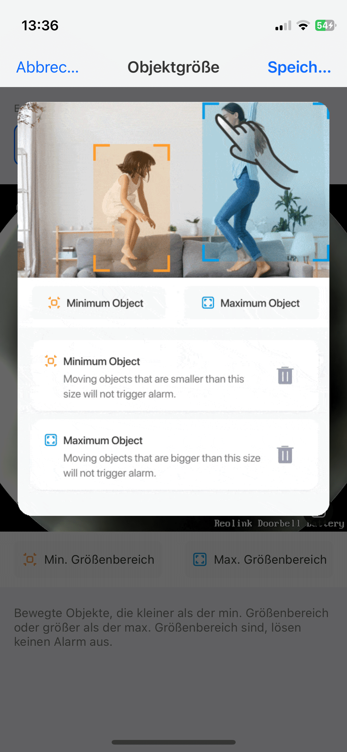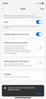 Natürlich bietet Reolink auch eine Bewegungserkennung. Diese arbeitet in der Videotürklingel erfreulich schlau und kann zwischen verschiedenen Bewegungsquellen unterscheiden. Detaillierte Anpassungen lassen sich dabei in der App vornehmen. So könnt ihr unter anderem festlegen, bei Objekten welcher Größe die Erkennung anschlagen soll. Auch lässt sich bestimmen, bei welchen Bewegungen es überhaupt eine Mitteilung geben soll. Die Reolink erkennt nicht nur Personen- und Tierbewegungen.