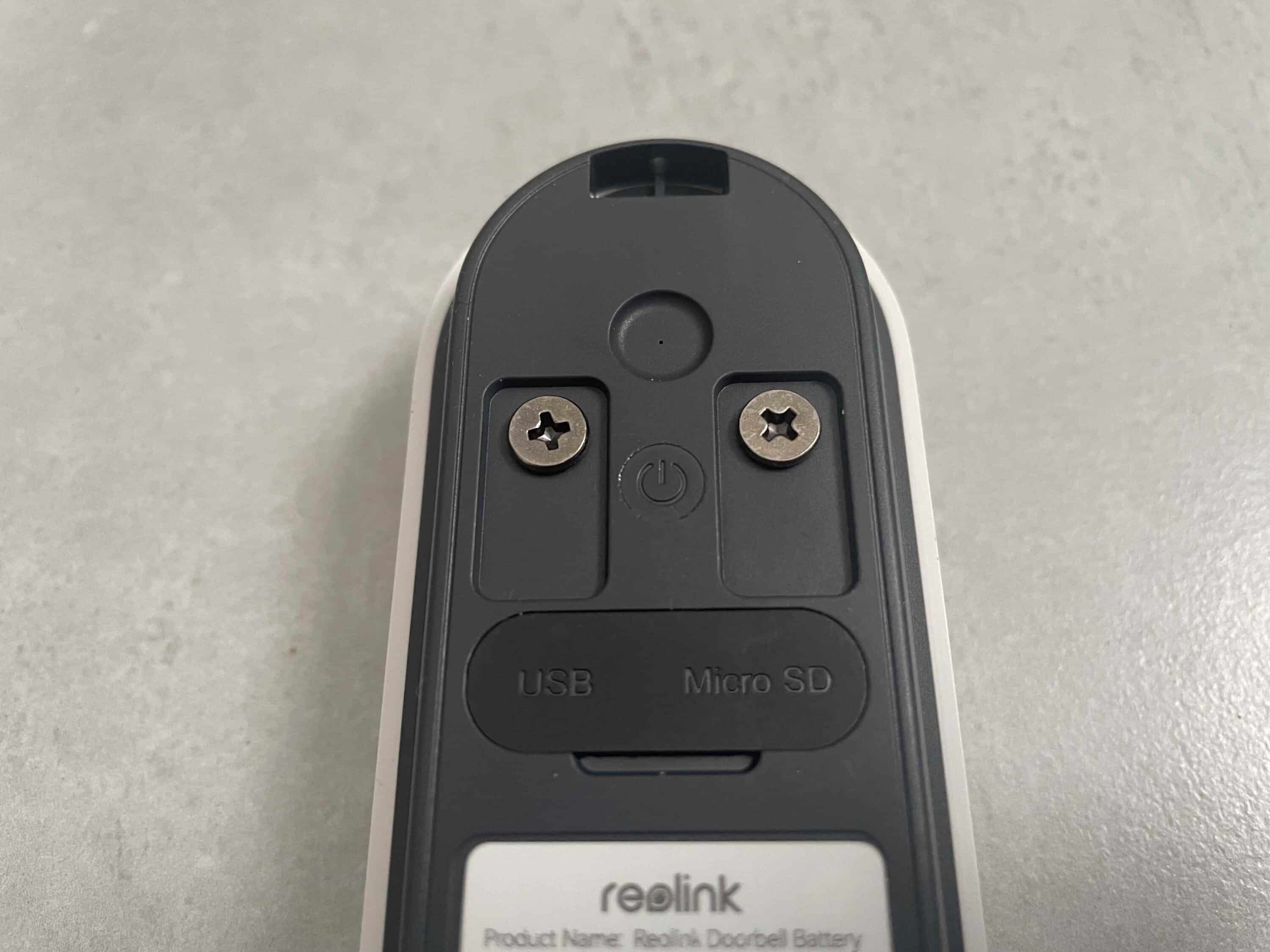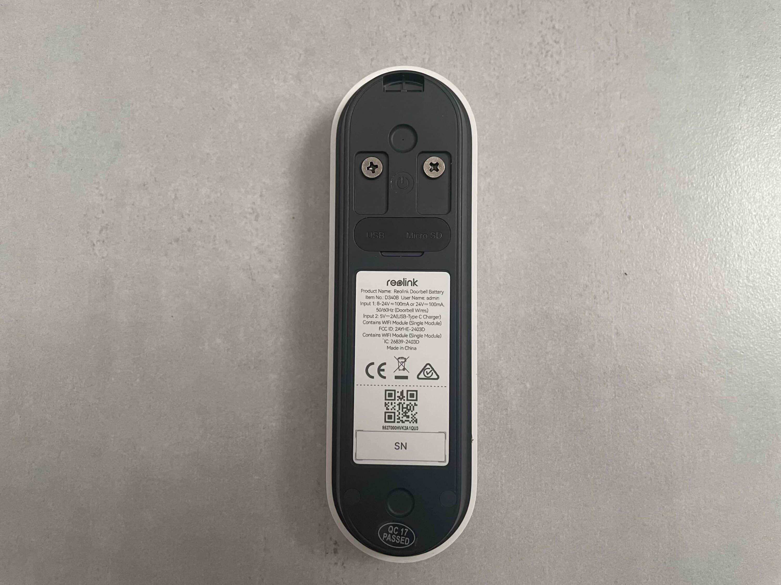 Mittig befindet sich ein Firmenlogo, das nicht zu auffällig ist. Auf der Rückseite befinden sich ein On/Off-Button sowie die beiden Anschlüsse für die optionale Verkabelung per Festanschluss am Stromkabel. Unter einer praktischen gummierten Kunststoffabdeckung sitzen außerdem der USB-C-Port zum Laden des Akkus und der microSD-Slot zum Einsetzen einer Speicherkarte. Die Verarbeitungsqualität der vornehmlich aus Kunststoff gefertigten smarten Videotürklingel bewegt sich auf einem hohen Niveau.