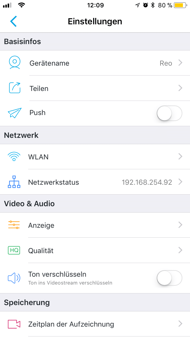 Bei den ganzen Spielereien vergisst man beinahe, das wichtigste einzustellen. Solch eine Kamera macht nur Sinn, wenn sie aufnimmt. Dabei sollte der Benutzer selbst nicht mit dem Smartphone direkt dahinter stehen. Um diese Funktion einzurichten, wird innerhalb der App vom Live-Bild auf die Einstellungen gewechselt. Dort findet sich unter Zeitplan die Möglichkeit, Zeitfenster zur Aufnahme zu aktivieren. Beispielsweise während der Arbeitsabwesenheit oder in der Nacht. Dies kann für jeden Wochentag einzeln oder identisch festgelegt werden. Die Kamera erkennt selbstständig, ob sie im Tag- oder Nachtmodus aufnimmt.