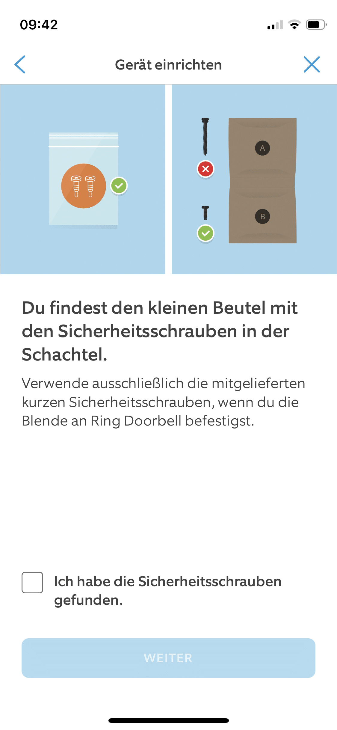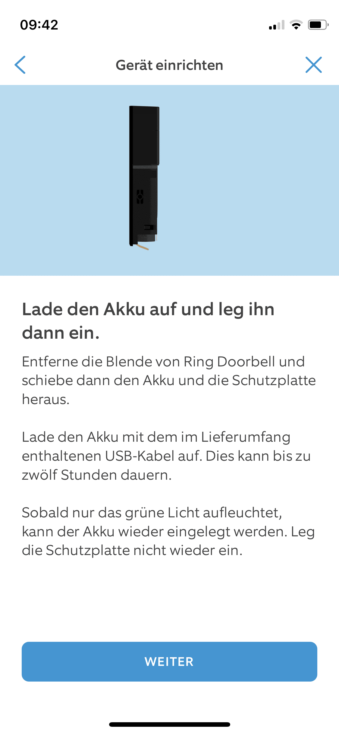 Schließlich soll die Klingel schlussendlich ja auch in der perfekten Position hängen. Während du den Akku auflädst, kannst du schon einmal ein wenig in der Bedienungsanleitung stöbern. Hier glänzt die Amazon-Tochter wieder mit einer nachvollziehbaren Installationsanleitung. Hast du die passende Stelle gefunden, musst du nur noch die beiliegenden Dübel, sowie Schrauben verwenden, um die Klingel an der Hauswand anzubringen. Solltest du die smarte Türklingel mit angewinkelter Ausrichtung nutzen wollen, nutzt du einfach die beiliegende Unterlegplatte.