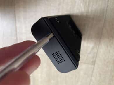 Mithilfe eines Drucks mit dem beiliegenden Tool kann man die Türklingel von der Rückwand lösen, um beispielsweise den Akku aufzuladen. Das mag mit dem neuen Konzept deutlich schneller gehen, ist aus meiner Sicht aber auch weniger sicher. Schließlich lässt sich der Mechanismus auch ohne das Sicherheitstool spielend leicht entriegeln.