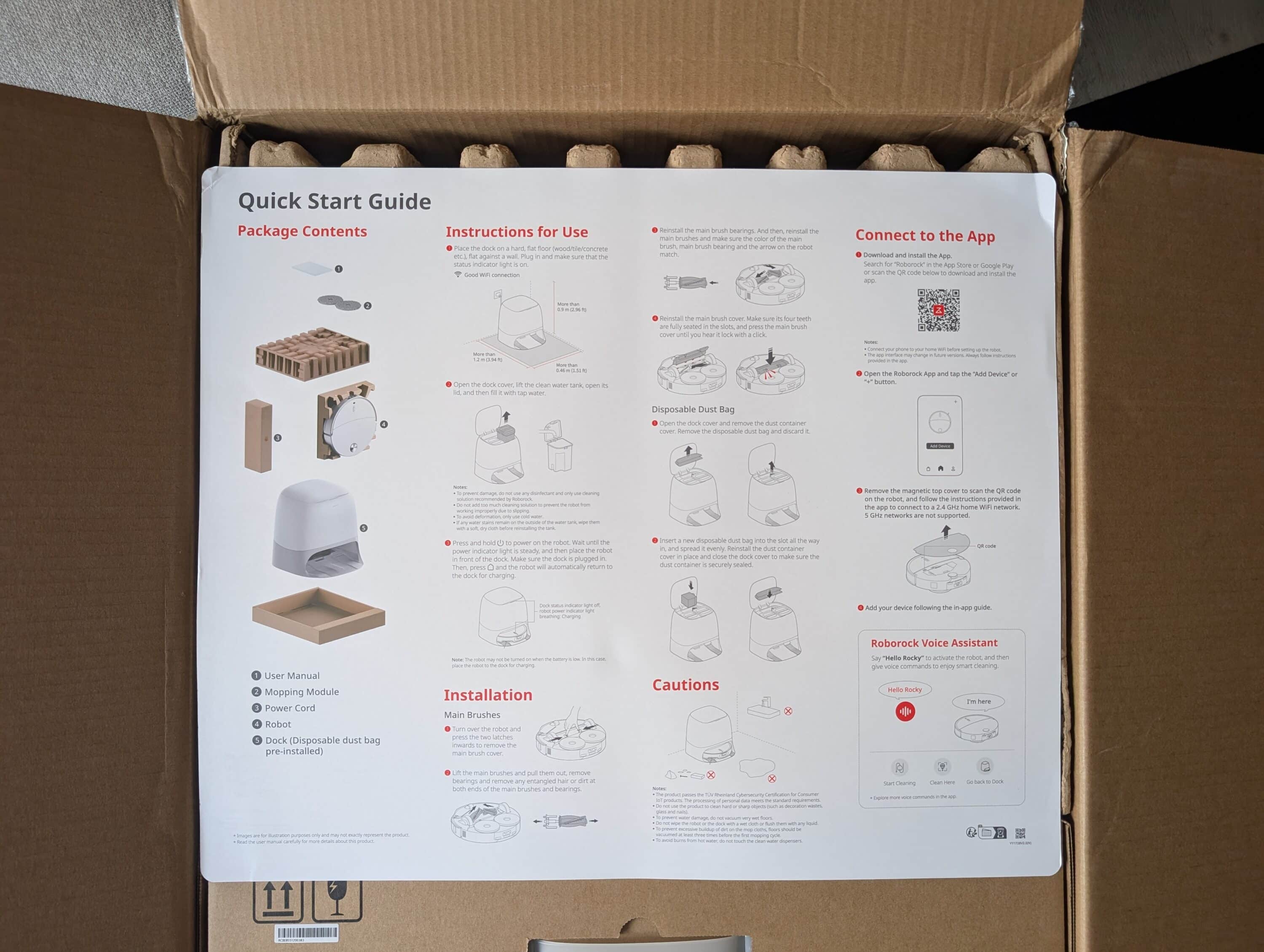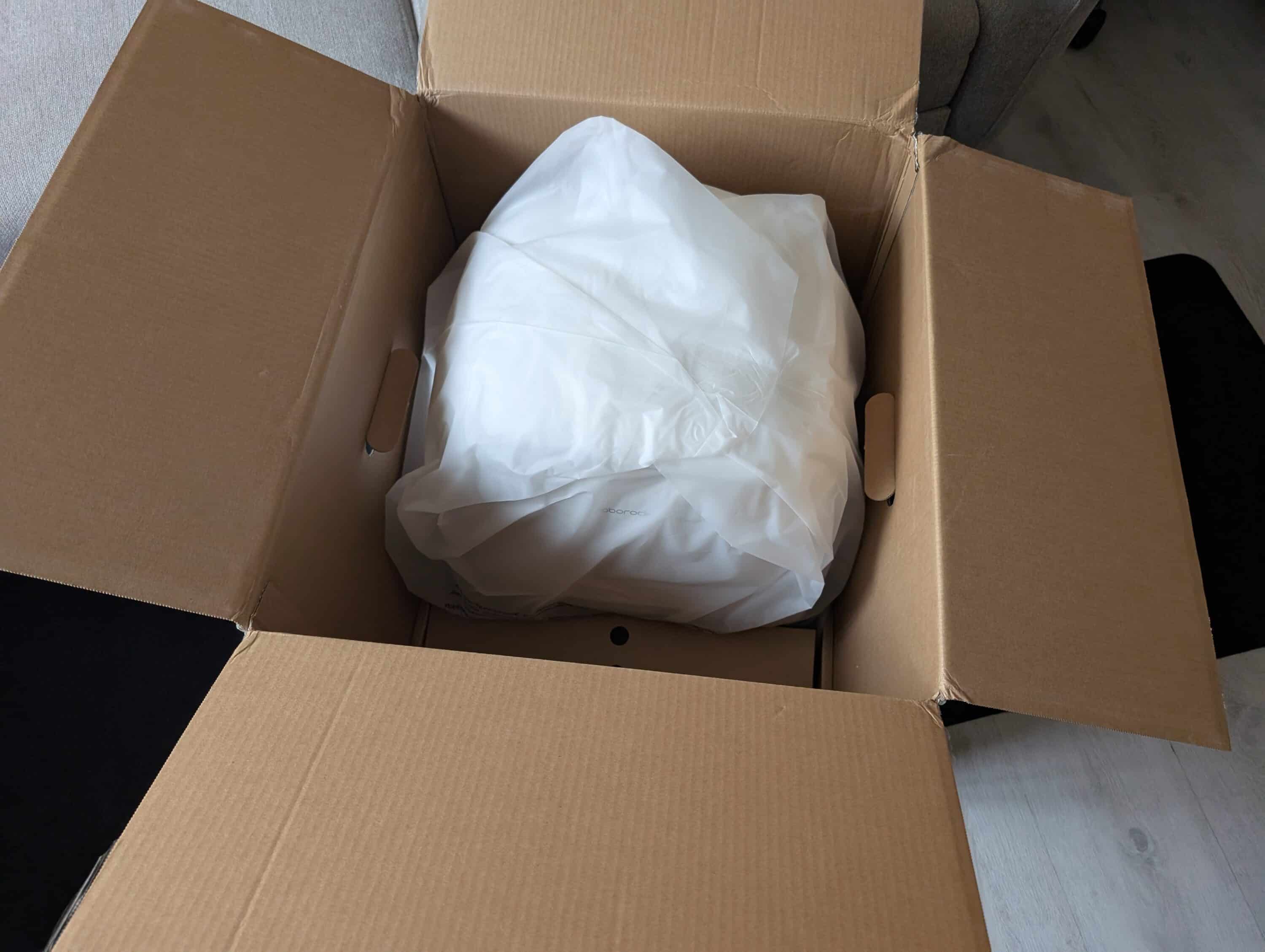 Beim Öffnen des Kartons zeigt sich zunächst eine durchdachte und nachhaltige Verpackung. Roborock setzt auf stabiles Karton-Engineering statt Styropor-Wüsten, jedes Teil hat seinen festen Platz. Roboter und Station sind in Plastikfolien gehüllt – das wirkt professioneller als die üblichen Verpackungen.