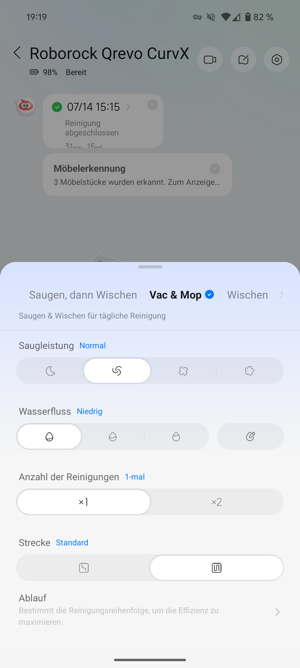 In der Praxis hat sich „Vac & Mop“ als unser Favorit herauskristallisiert – geht schneller und wird trotzdem ordentlich sauber. Die 4 Saugstufen unterscheiden sich wirklich merklich: „Leise“ mit 50 dB für nebenbei, „Standard“ als Alltagseinstellung, „Turbo“ und „Max“ mit bis zu 65 dB wenn’s gründlich werden soll. Letztere sind aber auch entsprechend laut. Man kann sogar einstellen, dass der CurvX bestimmte Bereiche bis zu 2 x abfährt – hilft bei hartnäckigen Verschmutzungen.