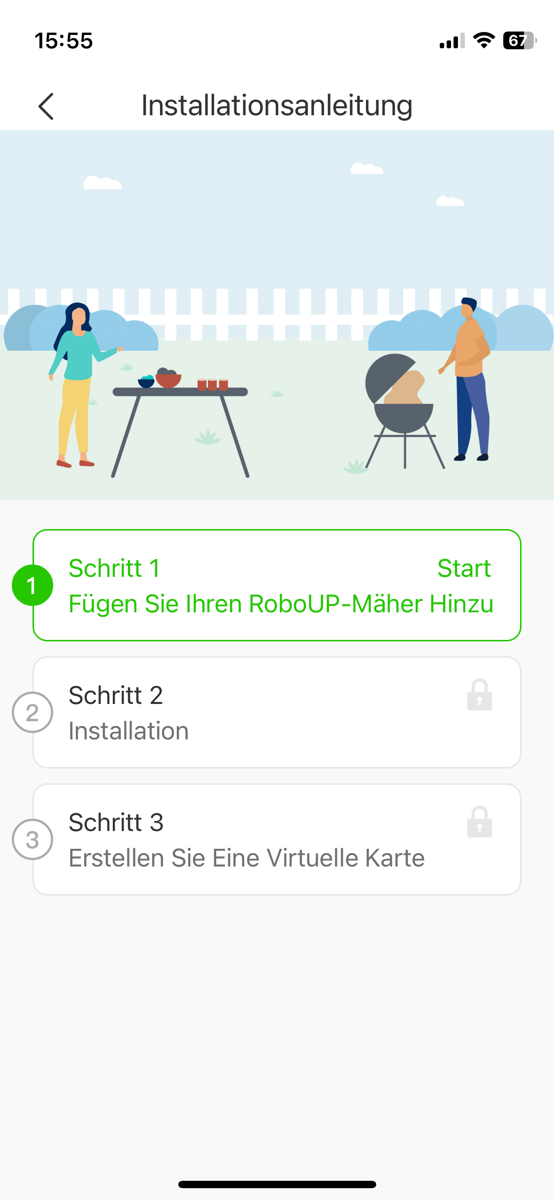 Wie bereits erwähnt, kannst du den Mähroboter über die Bedieneinheit am Display selbst steuern. Allerdings lässt du dir in diesem Fall viele verschiedene Einstellungsmöglichkeiten entgehen. Die Einrichtung ist schnell absolviert. So nimmst du am Anfang zunächst Verbindung zum Mähroboter auf und überführst ihn anschließend in dein WLAN.