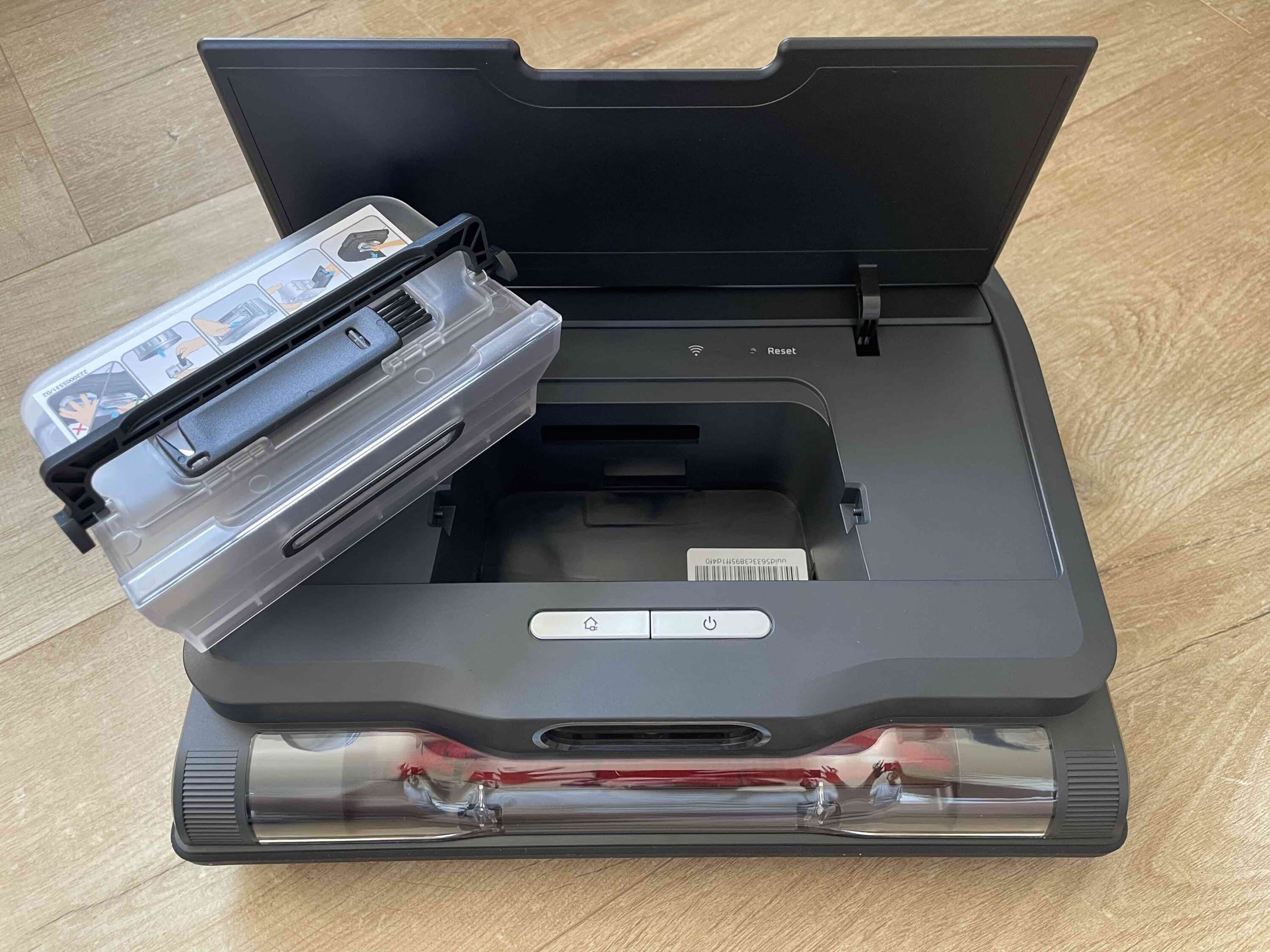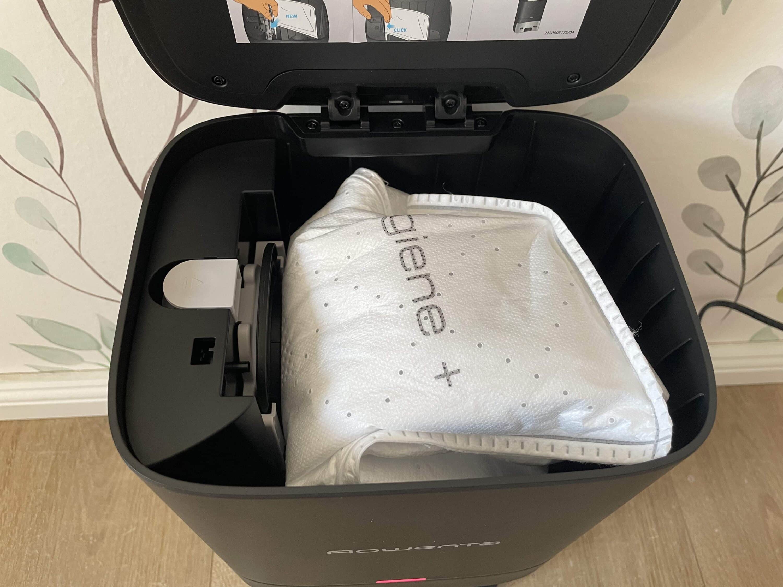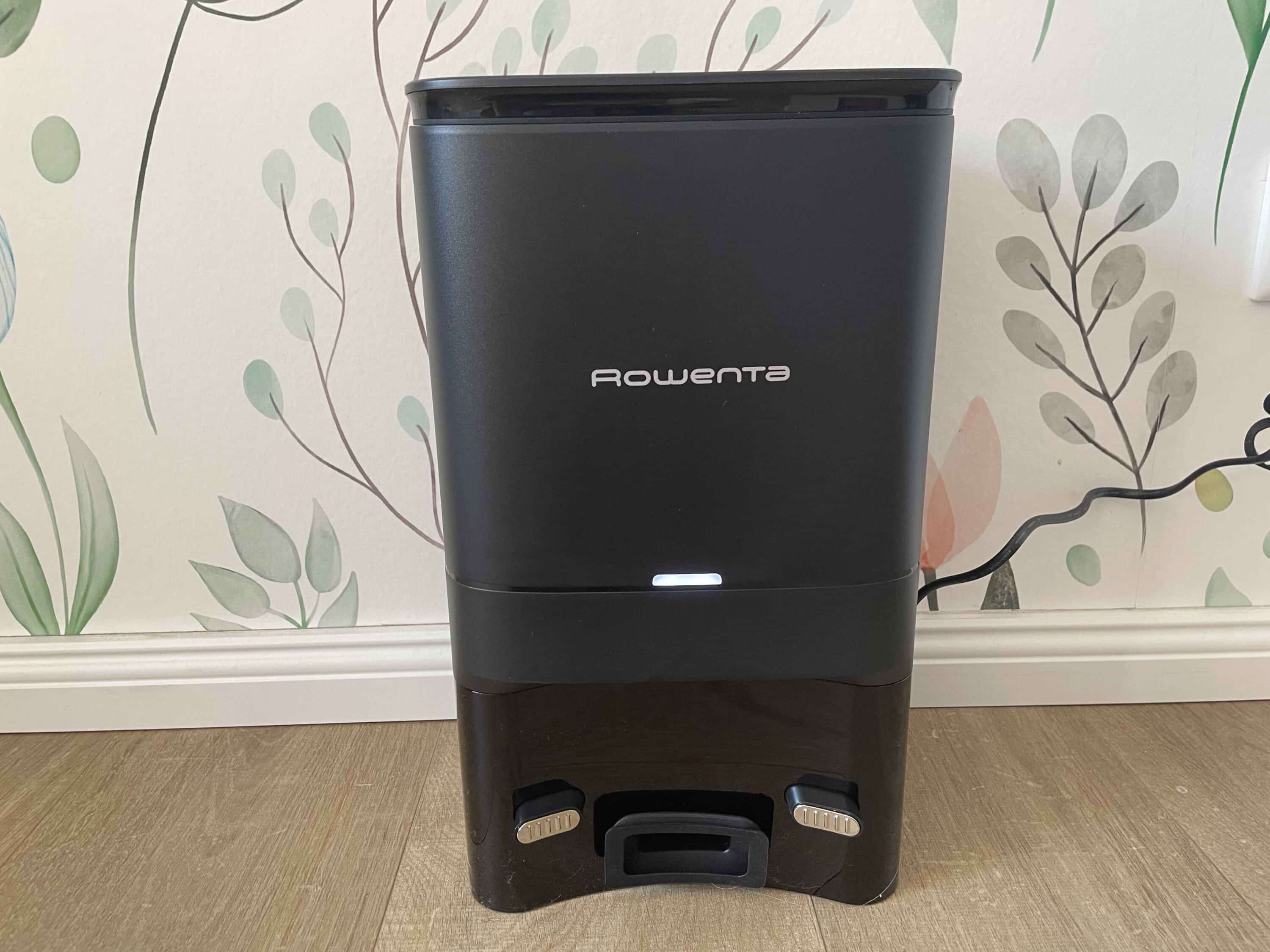 Gemeinsam mit dem Saugroboter ist das Reinigungssystem 32,5 cm breit, 38 cm hoch und 51,7 cm tief. An der Front der Station befindet sich neben dem Markenlogo noch eine kleine Status-LED, die Vorgänge wie das Laden des Robos signalisiert. Über den Deckel auf der Oberseite erhält man Zugang zu dem Staubbeutel im Innenraum. Leider setzt auch Rowenta auf kein beutelloses System. Das geschlossene System mag Allergiker freuen, doch es kommt zwangsläufig zu Folgekosten und unnötigem Müll.