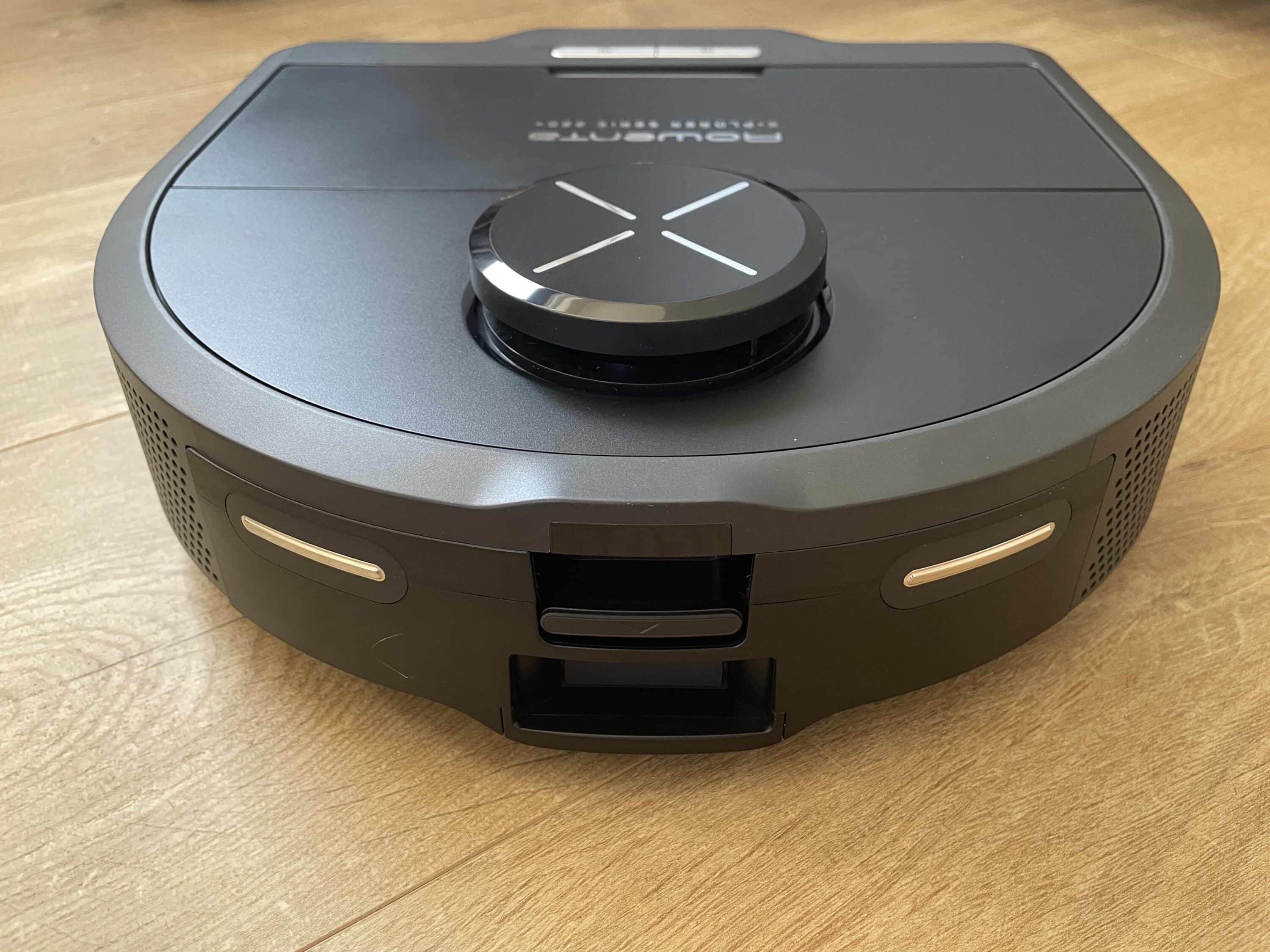 Dabei geht Rowenta noch einen Schritt weiter als der ähnlich geformte Eufy Omni S1 Pro (Test). Mithilfe der beiden rechtwinkligen Ecken an der Front verspricht der Hersteller eine optimale Eckenreinigung. Auf der Oberseite befinden sich im vorderen Bereich zwei längliche Buttons in silberner Farbe. Diese ermöglichen eine rudimentäre Steuerung. Mit dem einen Knopf lässt sich das Gerät starten und pausieren.