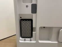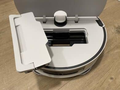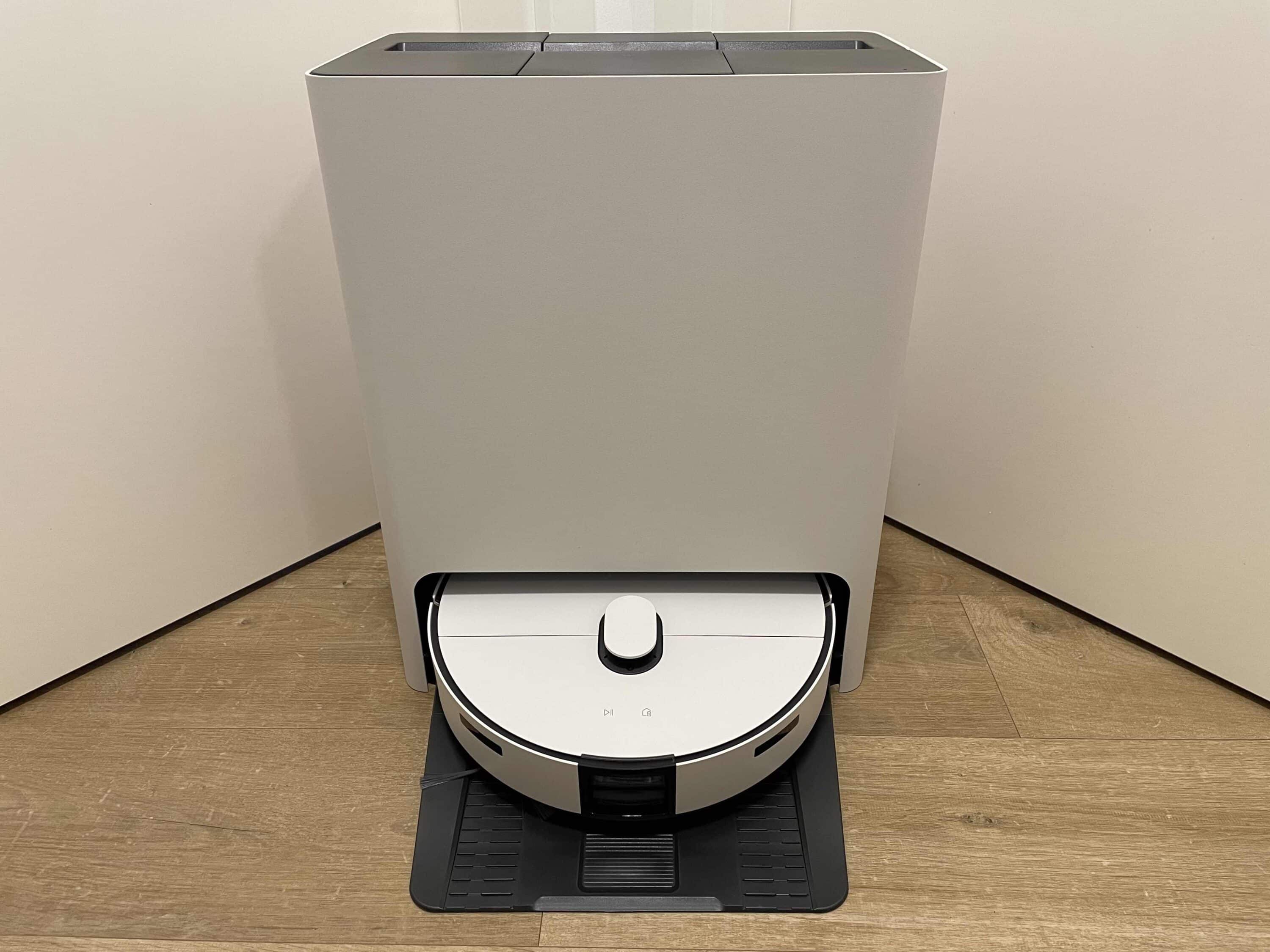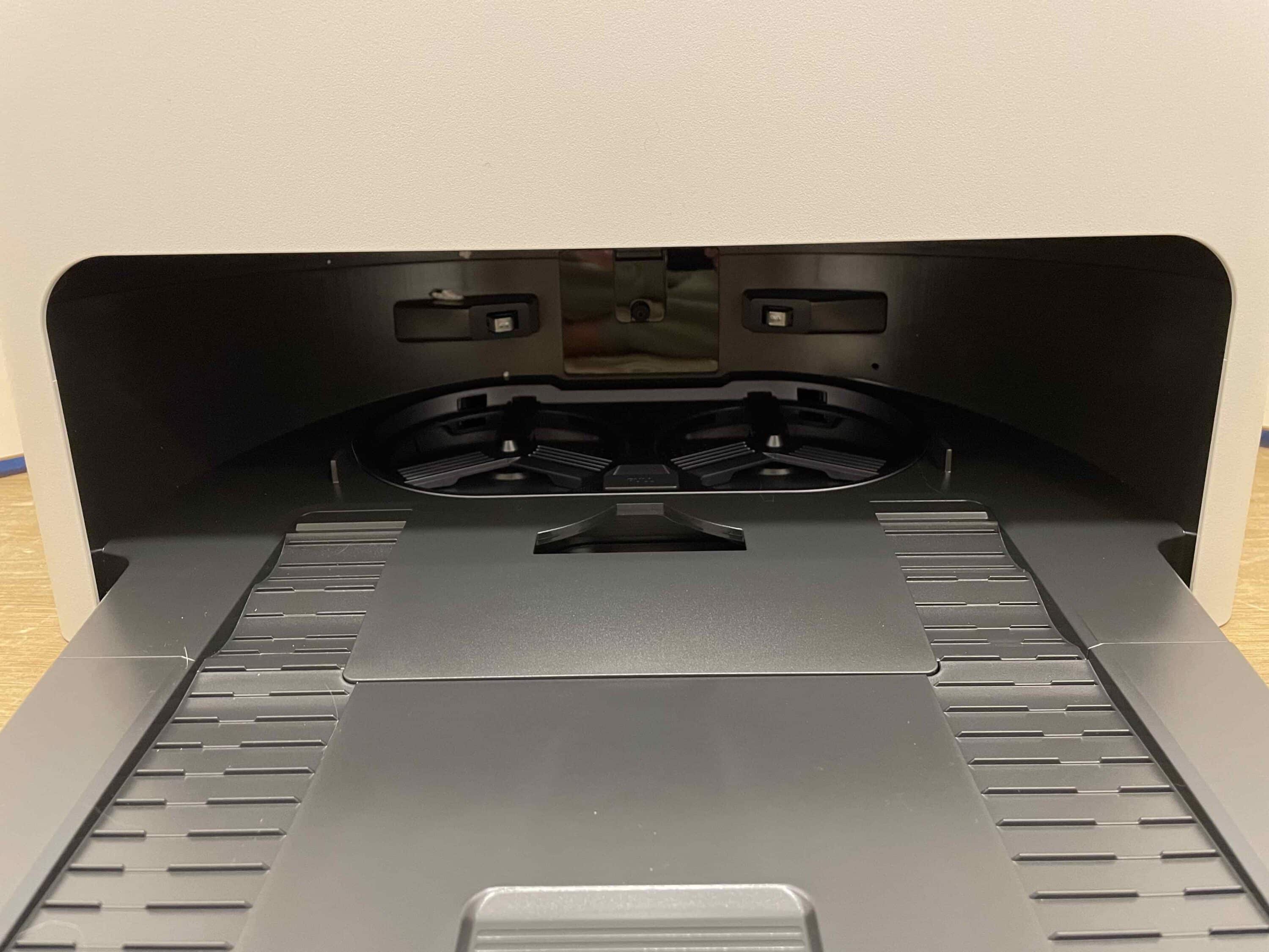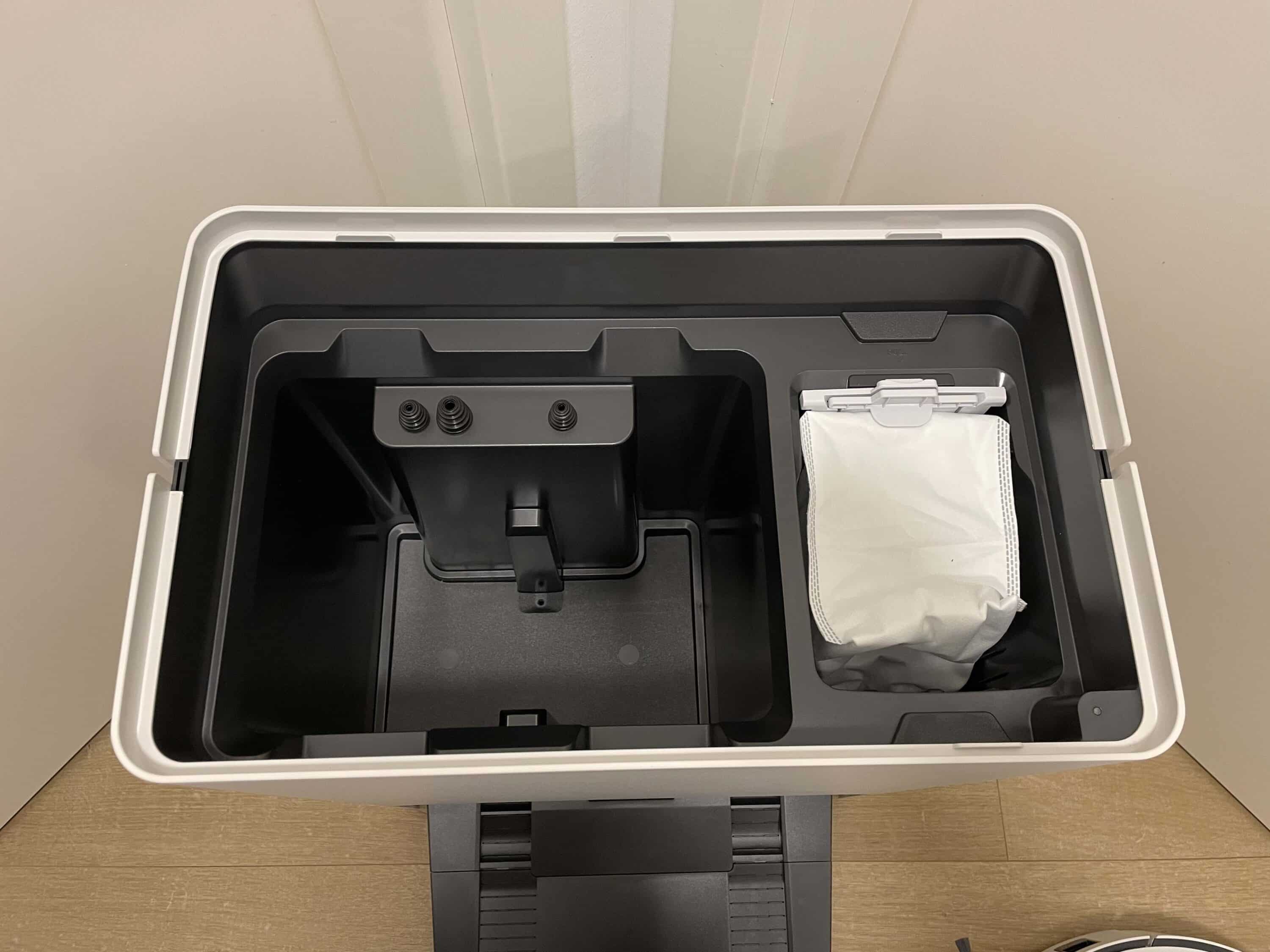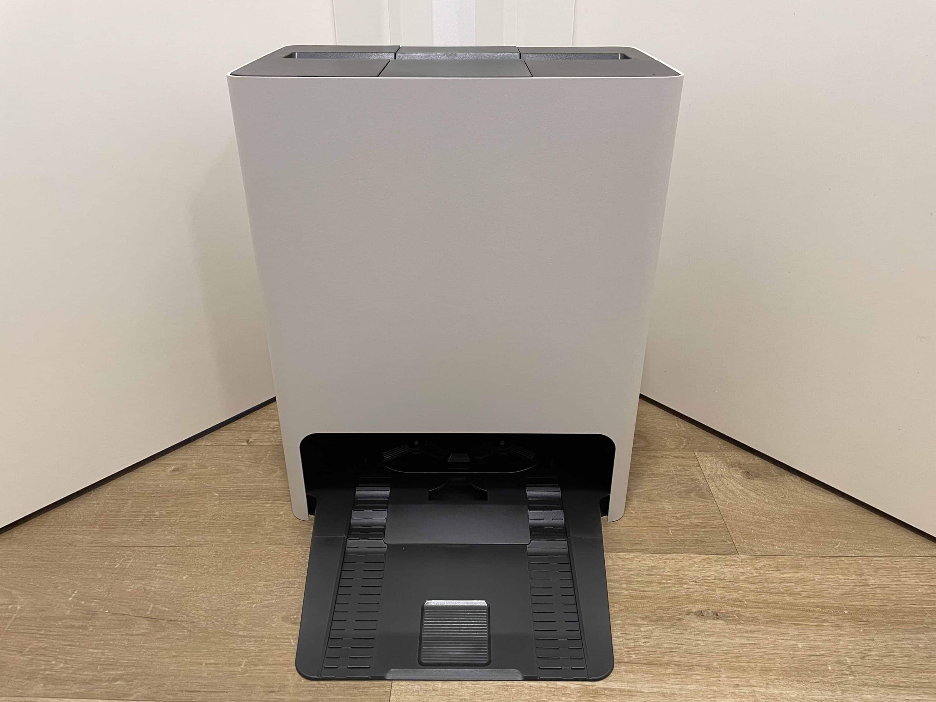 Über die Oberseite erhält man Zugang zu den drei Behältern der Station. Der Frischwassertank bietet ein Fassungsvermögen von 4 Litern, der Schmutzwassertank hat Platz für 3,6 Liter und der Staubbeutel fasst 2,5 Liter. Im unteren Bereich der Station wird nicht nur der Robo geladen, wenn er gerade einen Boxenstopp einlegt. Obendrein werden hier die Wischmopps gereinigt und der kleine integrierte Wassertank des smarten Haushaltshelfers mit Frischwasser betankt, damit dieser immer ausreichend Wasser an Bord hat.