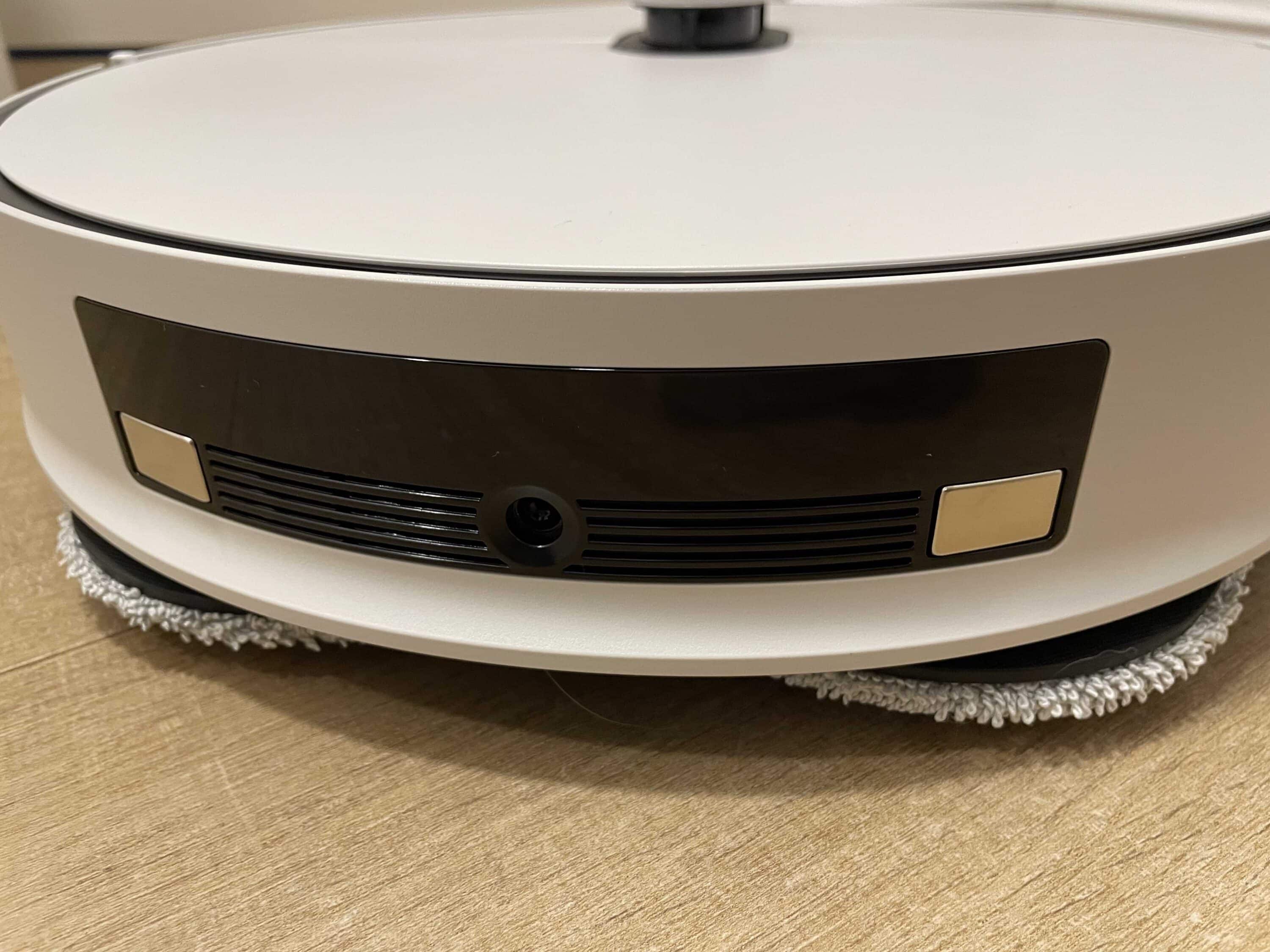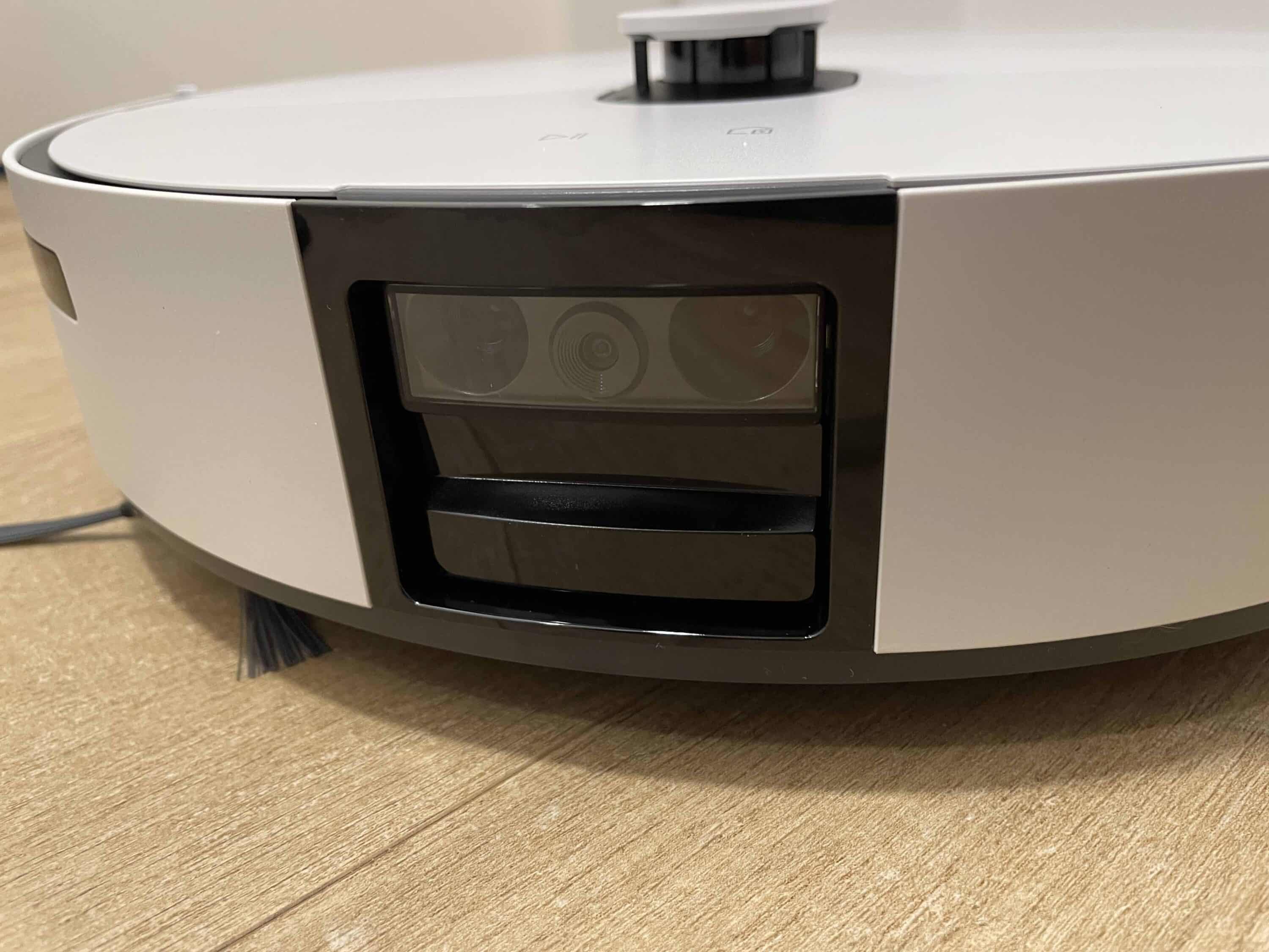 Obendrein befindet sich hier ein kleines Bedienfeld, über das sich rudimentäre Eingaben wie Start/Pause oder das Zurückschicken zur Station tätigen lassen. Über die Wartungsklappe auf der Oberseite erhält man außerdem Zugriff auf den Staubbehälter des Saugers und erblickt die WiFi-LED. Beim Blick auf die Front des Jet Bot Combo AI erblickt man ein weiteres Herzstück für die Orientierung.