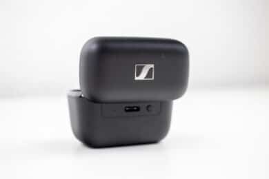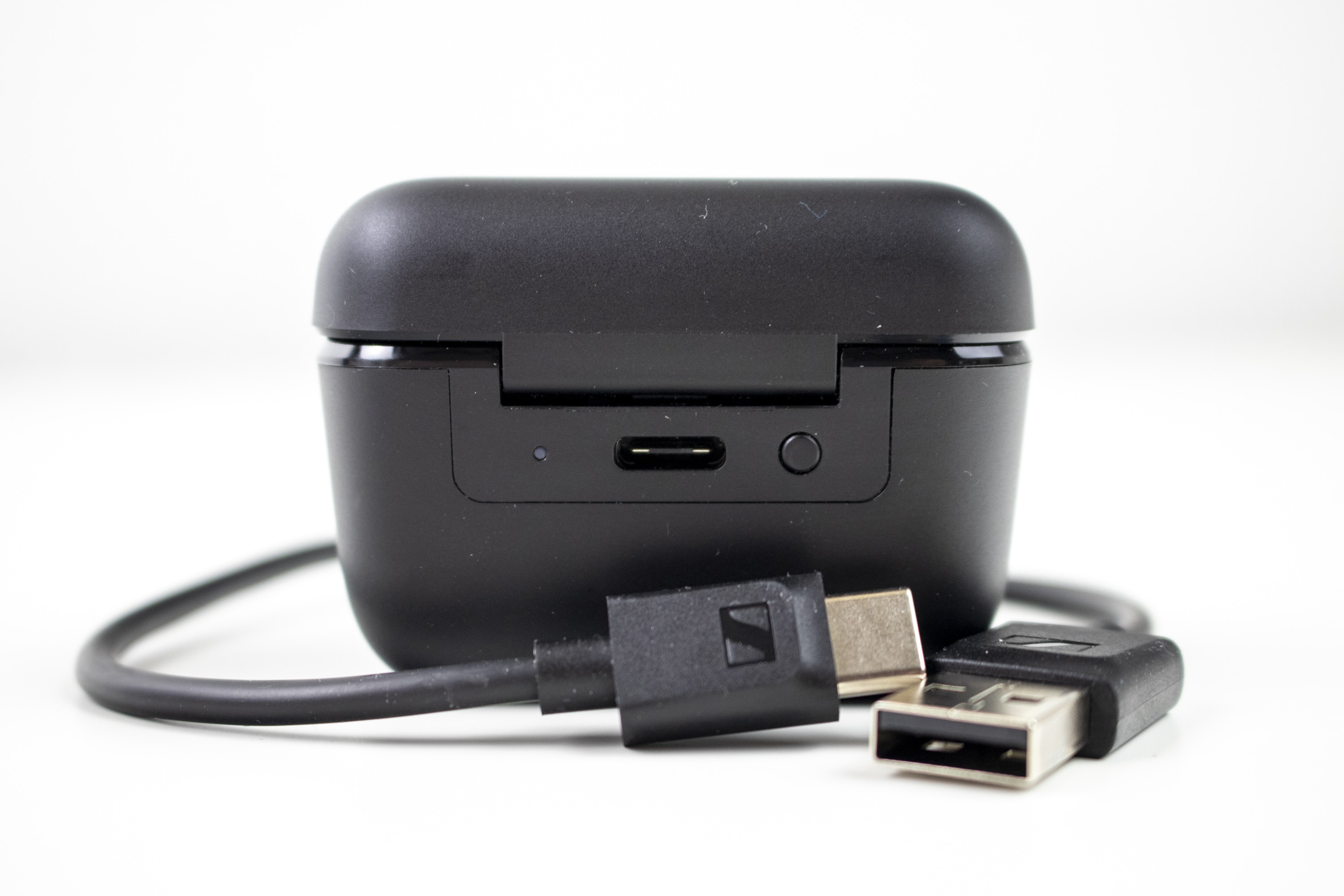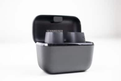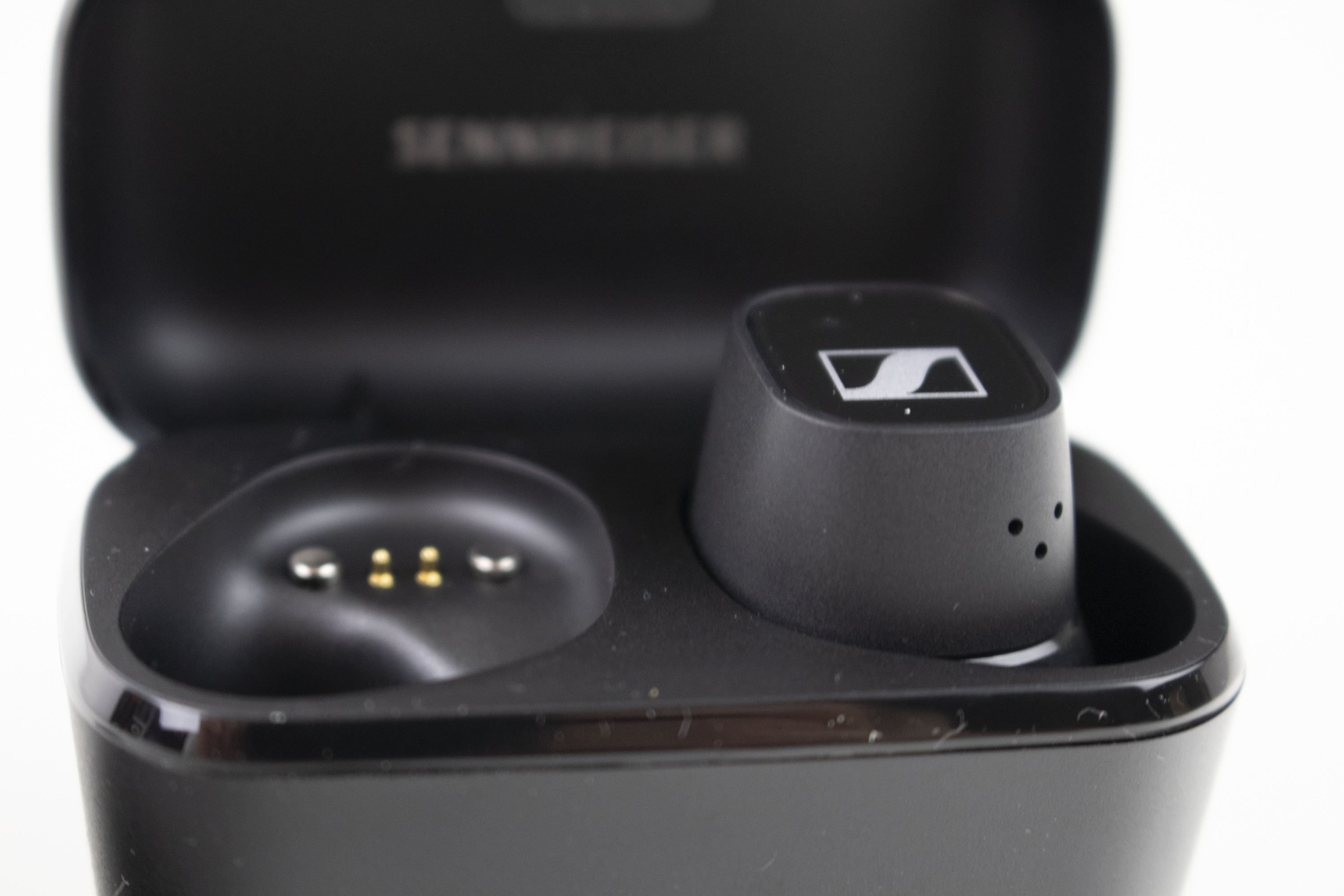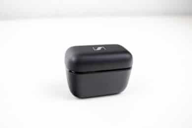 Die Ohrhörer sind viereckig, aber abgerundet gebaut und das Sennheiser-Logo prangt auf der Außenfläche. Diese dient zeitgleich als Touch-Bedienelement, wozu wir später noch kommen. Das komplette Gehäuse ist aus robustem Kunststoff.