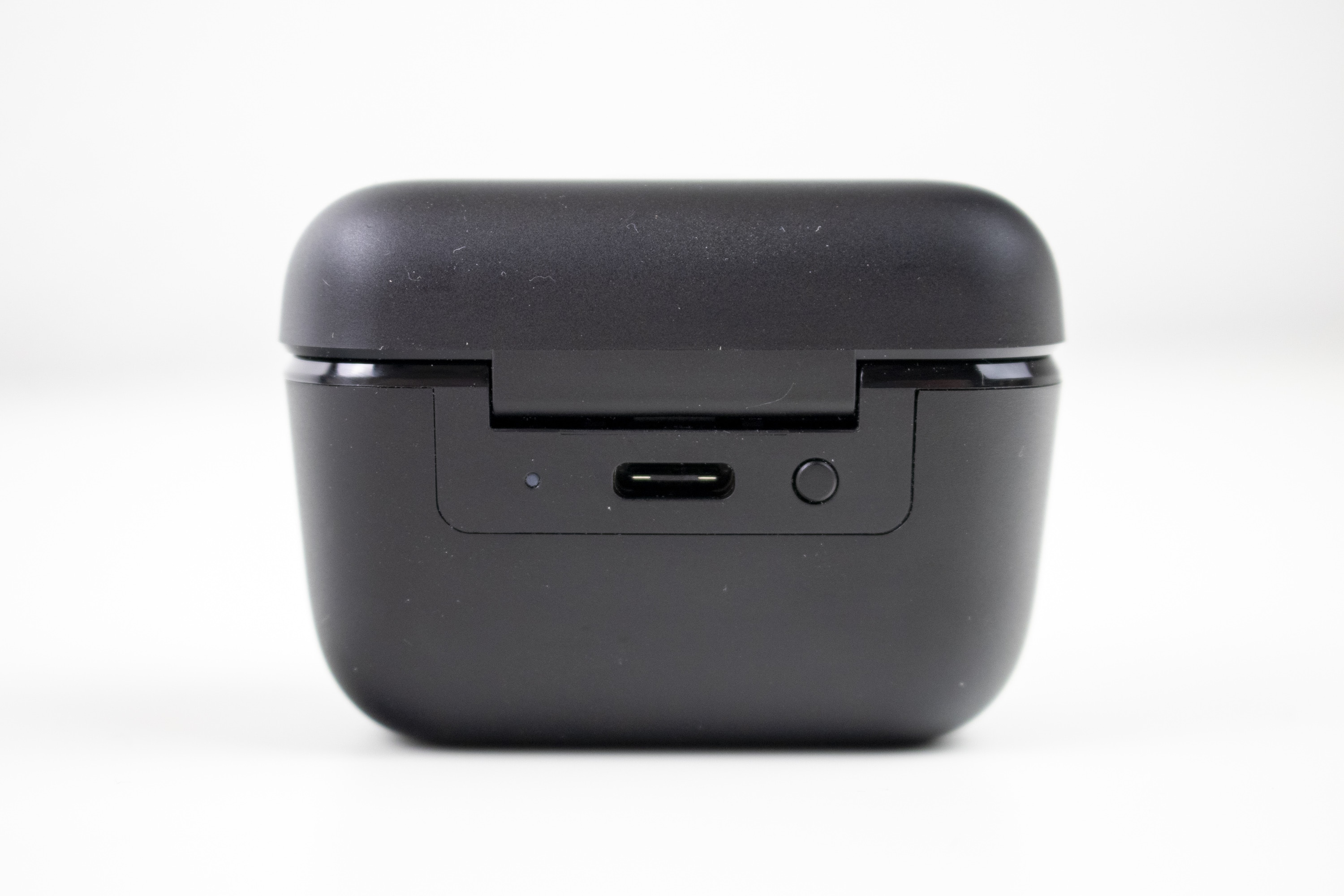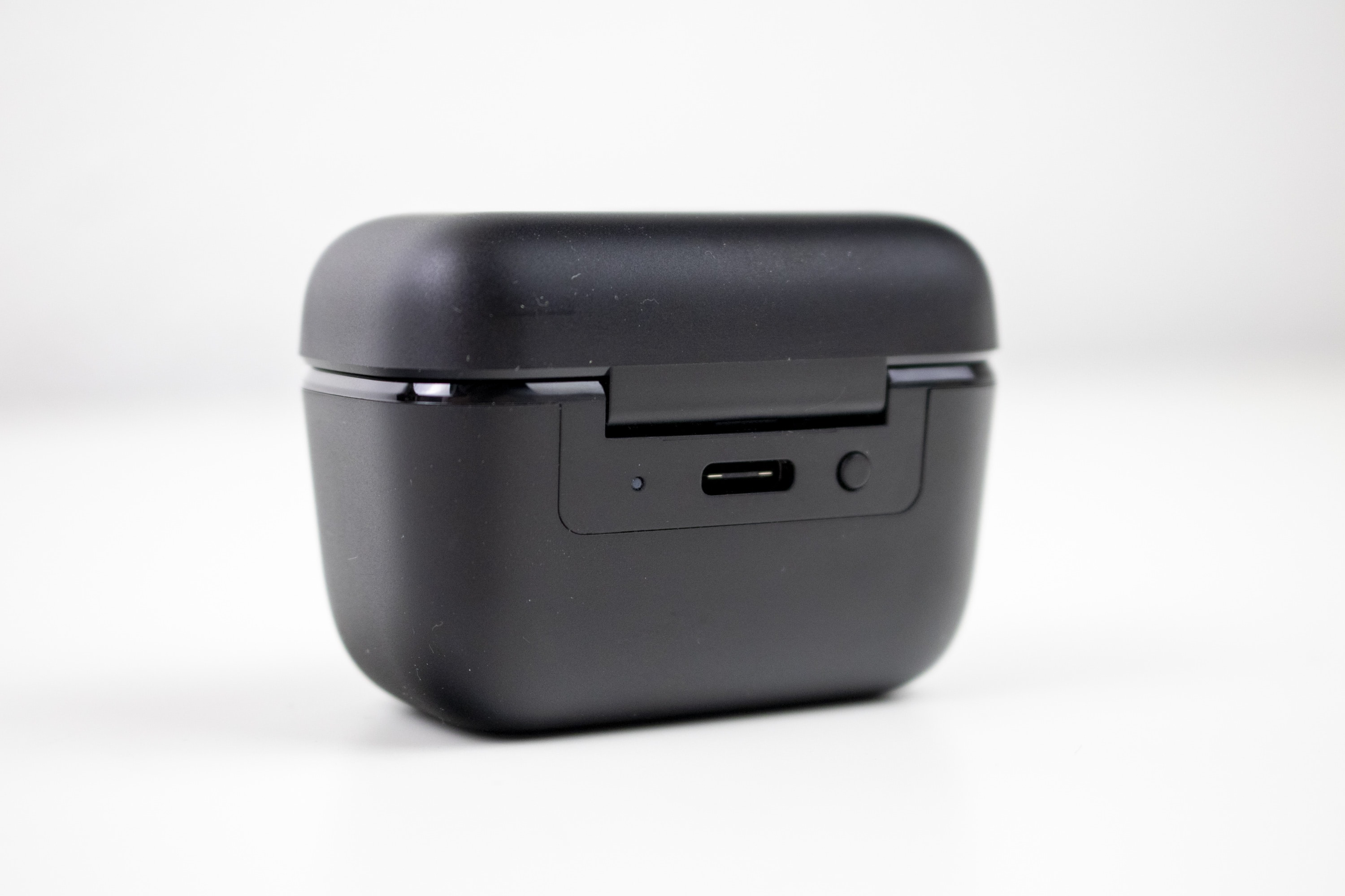 Das Ladeetui zieht die schlichte Nummer ebenfalls durch. Lediglich ein Streifen rund um den Rand der Öffnung ist glänzend Gehalten. Ansonsten wurde auch hier die Farbe matt gehalten. Was besonders auffällt, ist die Größe des Etuis. Mit gerade einmal 59 Millimetern Länge passt sie in jede Jackentasche. Hier wurde wirklich nur das Minimum an Material verbraucht, damit beide Ohrhörer und ein Akku hereinpassen. Eine Luxusverpackung ist bei dem Preis natürlich nicht zu erwarten.