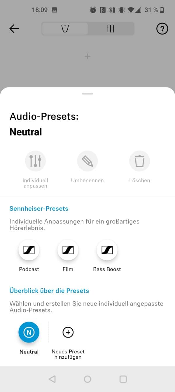 Als Begleit-App kommt Sennheiser Smart Control zum Einsatz, die für iOS und Android kostenlos heruntergeladen werden kann. Hier besteht die Möglichkeit, Firmware-Updates einzuspielen, die Touch-Steuerung anzupassen oder den Klang mithilfe eines Equalizers nach den eigenen Vorlieben anzupassen.