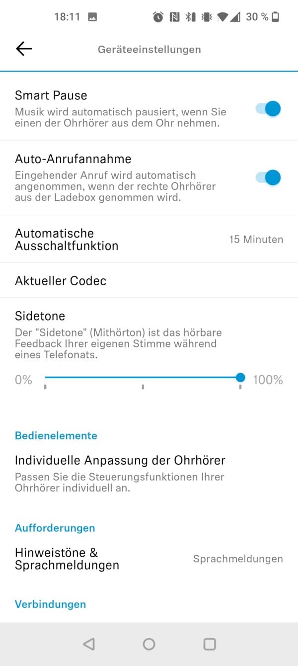 Zudem besteht softwareseitig die Option, verschiedene Funktionen wie Smart-Pause, ANC oder eine automatische Annahme von Anrufen ein- oder auszuschalten. Letztlich bietet die Software nahezu alles was man erwarten würde, gerade hinsichtlich der EQ-Einstellungen hätten wir uns aber ein paar zusätzliche Optionen gewünscht.