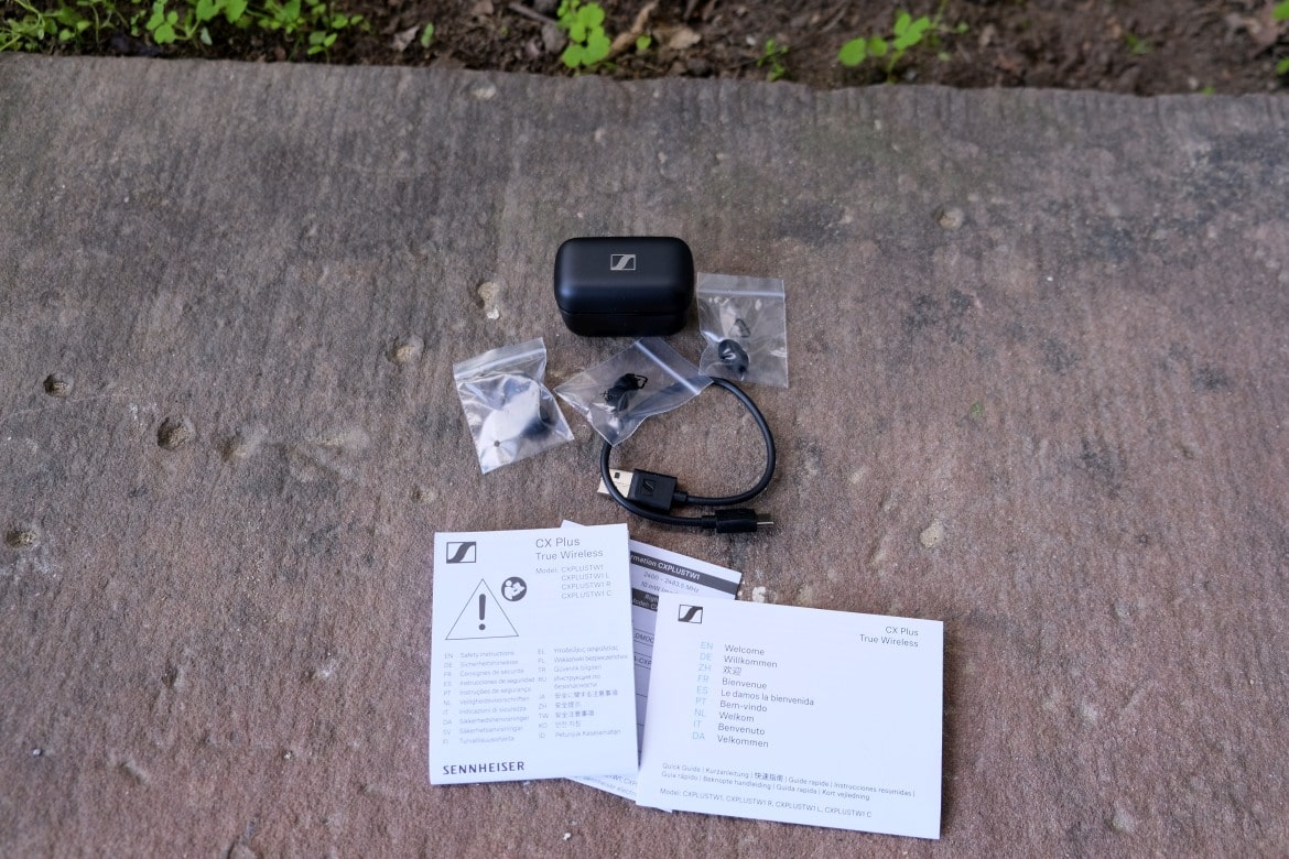 Beim Öffnen des Kartons werden wir in der oberen Hälfte direkt von dem Ladeetui empfangen. Darunter befindet sich die Schnellstart-Anleitung, die unter sich den weiteren Lieferumfang beherbergt. Neben einem Garantie-Kärtchen und einer ausführlicheren Anleitung legt Sennheiser lediglich ein USB-A-auf-USB-C-Kabel zum Laden des Case, sowie drei Paare an Silikon-Ohreinsätzen in verschiedenen Größen bei. XS und S richten sich vor allem an Nutzer mit kleinen Ohren, während die L-Variante etwas größer ausfällt als die bereits vorinstallierte Größe M.