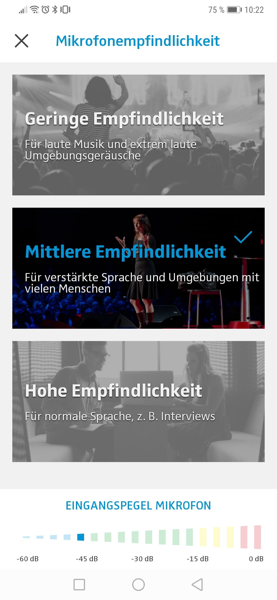 Die Empfindlichkeit des Mikrofons während der Aufnahme kann in drei Stufen eingestellt werden, um auf unterschiedliche Umgebungssituationen zu reagieren.