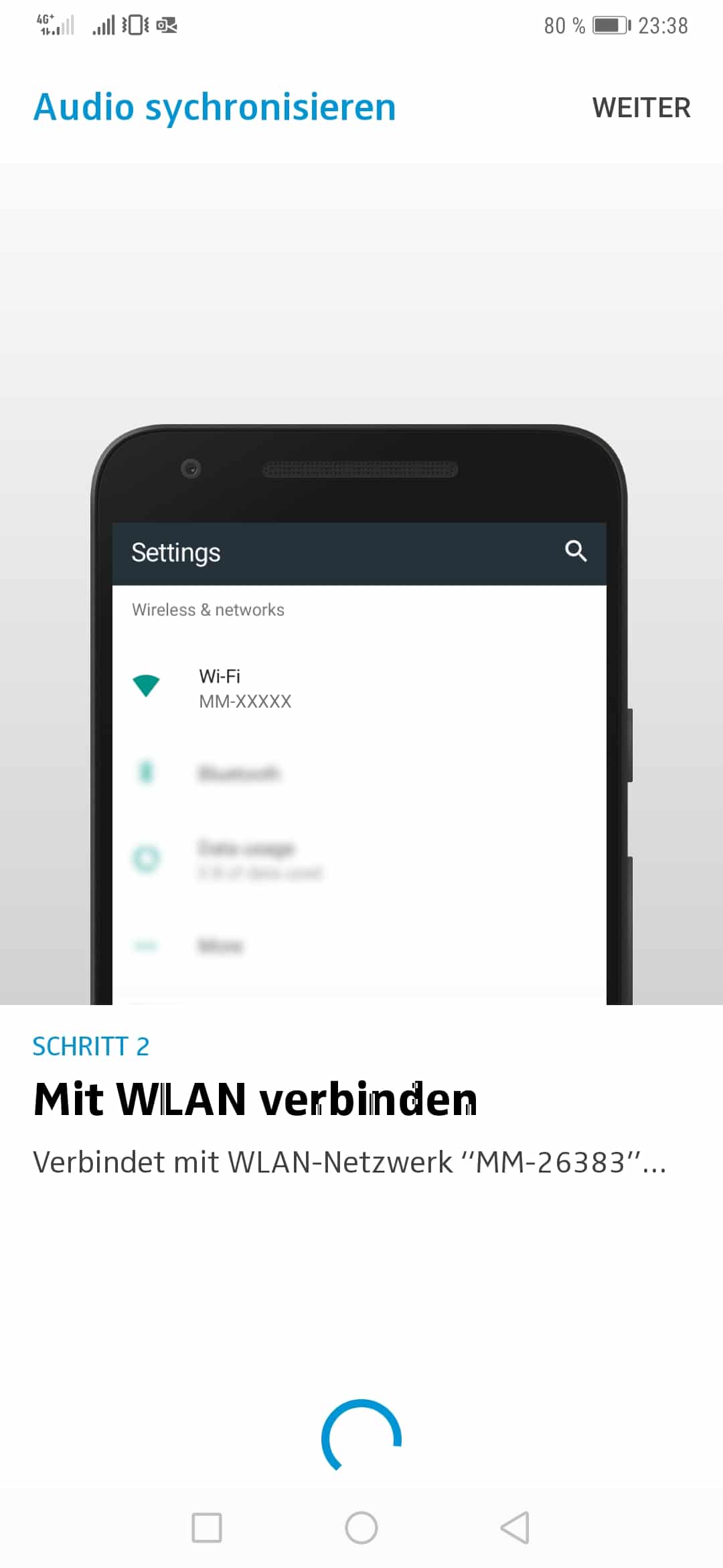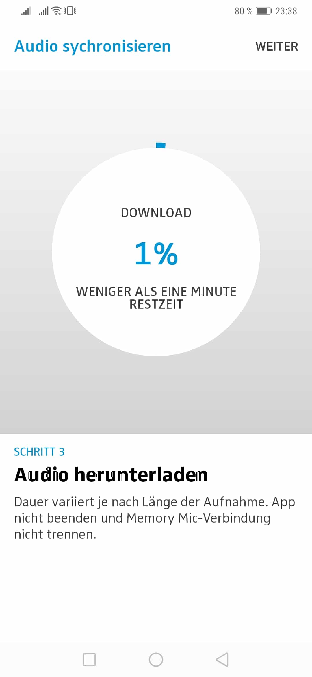 Im nächsten Schritt müssen Video und Audio zusammengeführt werden. Hierzu wird zunächst eine WLAN-Verbindung zwischen Smartphone und Mikrofon aufgebaut. Steht die Verbindung, kann die Audioaufnahme exportiert werden, woraufhin sie in der App mit dem Video zusammengefügt wird. Die Dauer dieses Synchronisationsprozesses ist abhängig von der Länge sowie von der Qualität der Aufnahme. Er kann zwischen wenigen Sekunden und einigen Minuten dauern. Für ein vier minütiges Video haben wir ca. 40 Sekunden gebraucht, um die Verbindung aufzubauen und die Aufnahme aufs Smartphone zu übertragen. Die Übertragung an sich hat dabei nur wenige Sekunden gedauert.