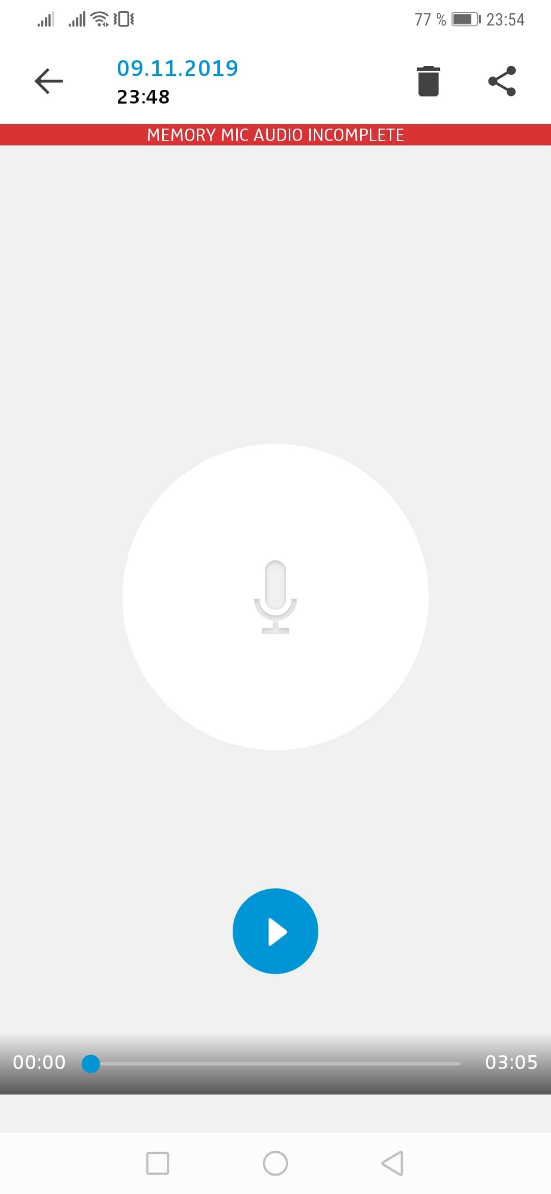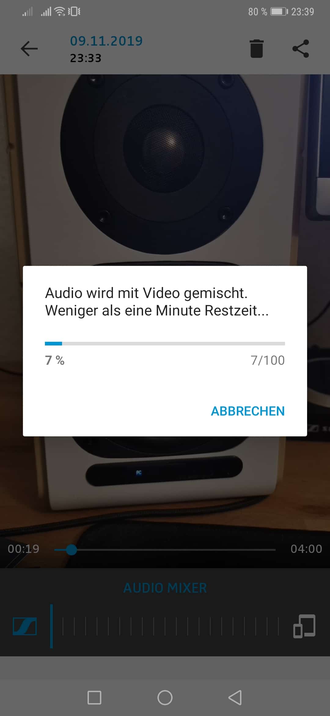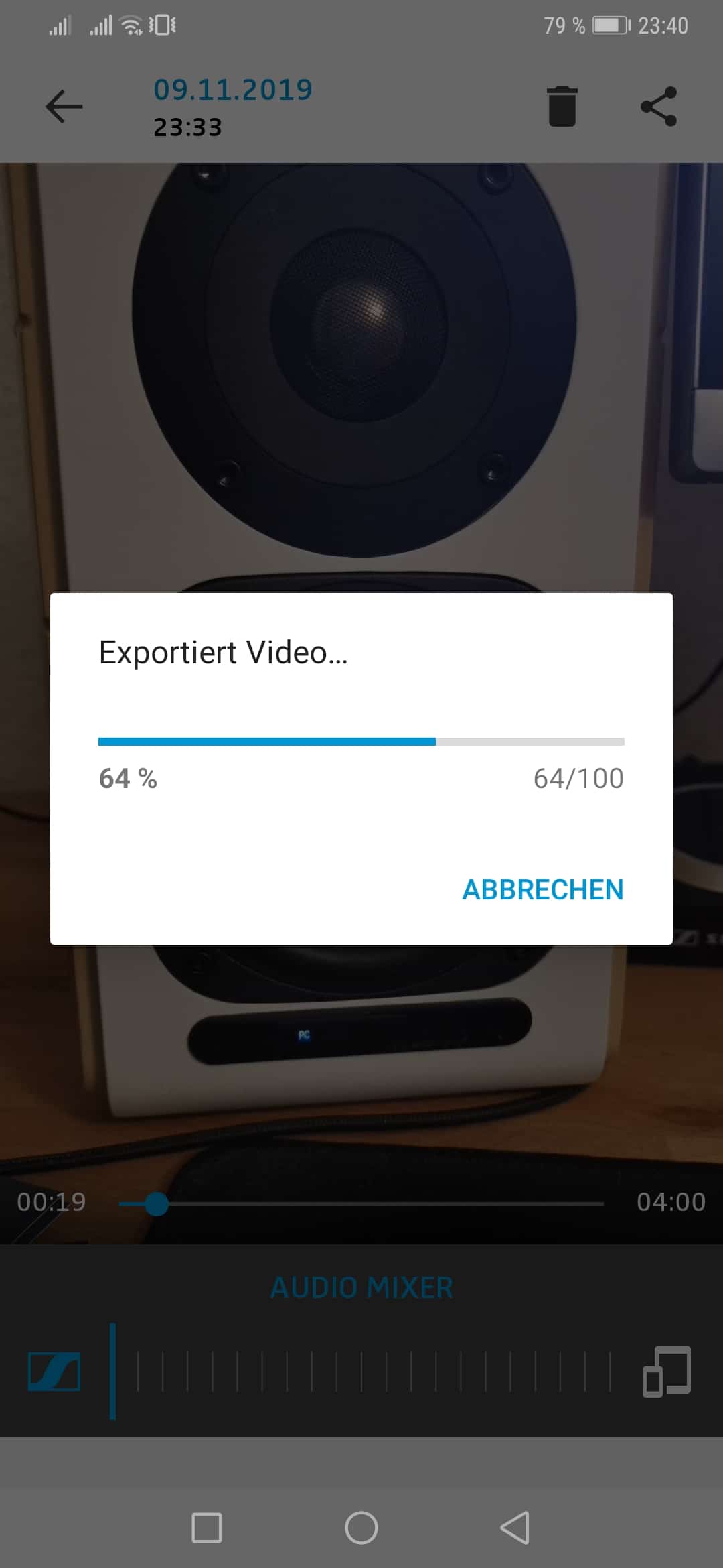 Soll das so entstandene Video anschließend aus der App in die gewöhnliche Videobibliothek exportiert werden, muss mit einem weiteren zeitraubenden Exportprozess gerechnet werden – hier ist standardmäßig mit einigen Minuten zu rechnen. Auf unserem leistungsstarken Huawei Mate 20 Pro haben wir für das 4-Minuten-Video eine Minute zur Umwandlung gebraucht. Die Full-HD-Videoaufnahme war nach dem Export 514 MB groß. Eine reine Audioaufnahme (WAV) hingegen 21,9 MB. Anders als beim Video betrug die Bitrate bei der Audioaufnahme nicht 269 kBit/s sondern 767 kBit/s.