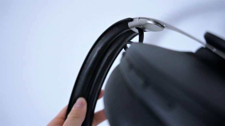 Während des Tests, hat mich die Funktionsweise der Größeneinstellung erstaunt. Sie weist weder Klickgeräusche auf, noch kann man sich an einer Einrastfunktion orientieren. Man weiß so nie genau, ob auf beiden Seiten die gleiche Größe eingestellt wurde oder, ob die Kopfhörer nun schief sitzen. Außerdem ist das Verstellen sehr umständlich – dabei schiebt man den Knopf mit dem Logo nämlich in der Schiene nach oben oder unten. Leider weiß man dabei nicht genau, wo man anfassen soll, gerade wenn man den Kopfhörerbügel kleiner einstellen möchte. Mir leuchtet der Mechanismus nicht ganz ein und ich finde es schade, dass sich Sennheiser hier keine smartere Lösung hat einfallen lassen.