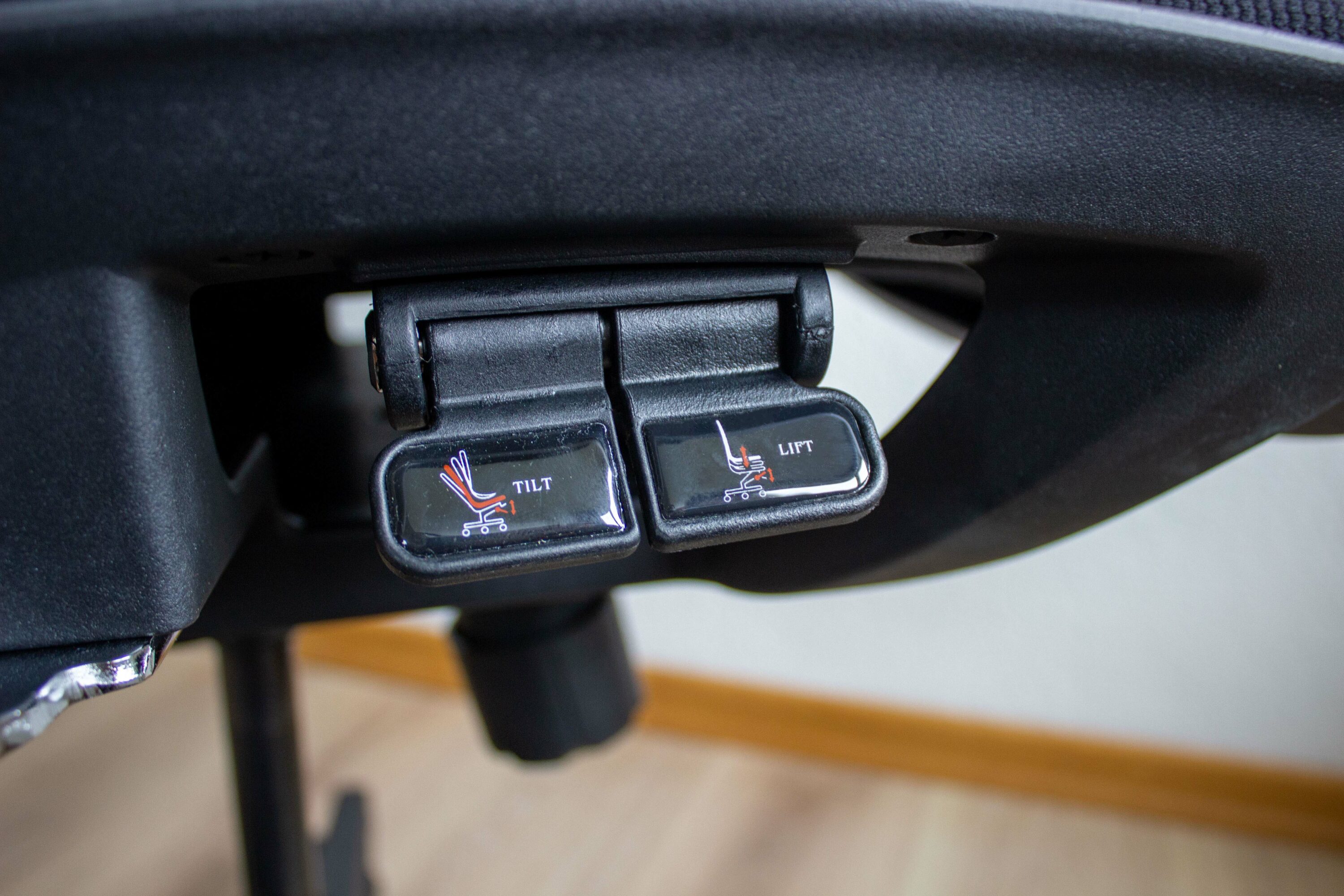 Die Auflageflächen der Arme fühlt sich nicht besonders hochwertig an. Diese lässt sich ein bisschen nach links und rechts bewegen, selbst wenn die Position festgestellt ist. Das liegt vermutlich an der üblichen Mechanik der Lehnen, die eigentlich bei jedem Stuhl zum Einsatz kommt und Massenware ist. Erkennen lässt sich dies auch an der Gasdruckfeder. Laut Aufdruck stammt das Klasse-4-Modell von Samhongsa, China.
