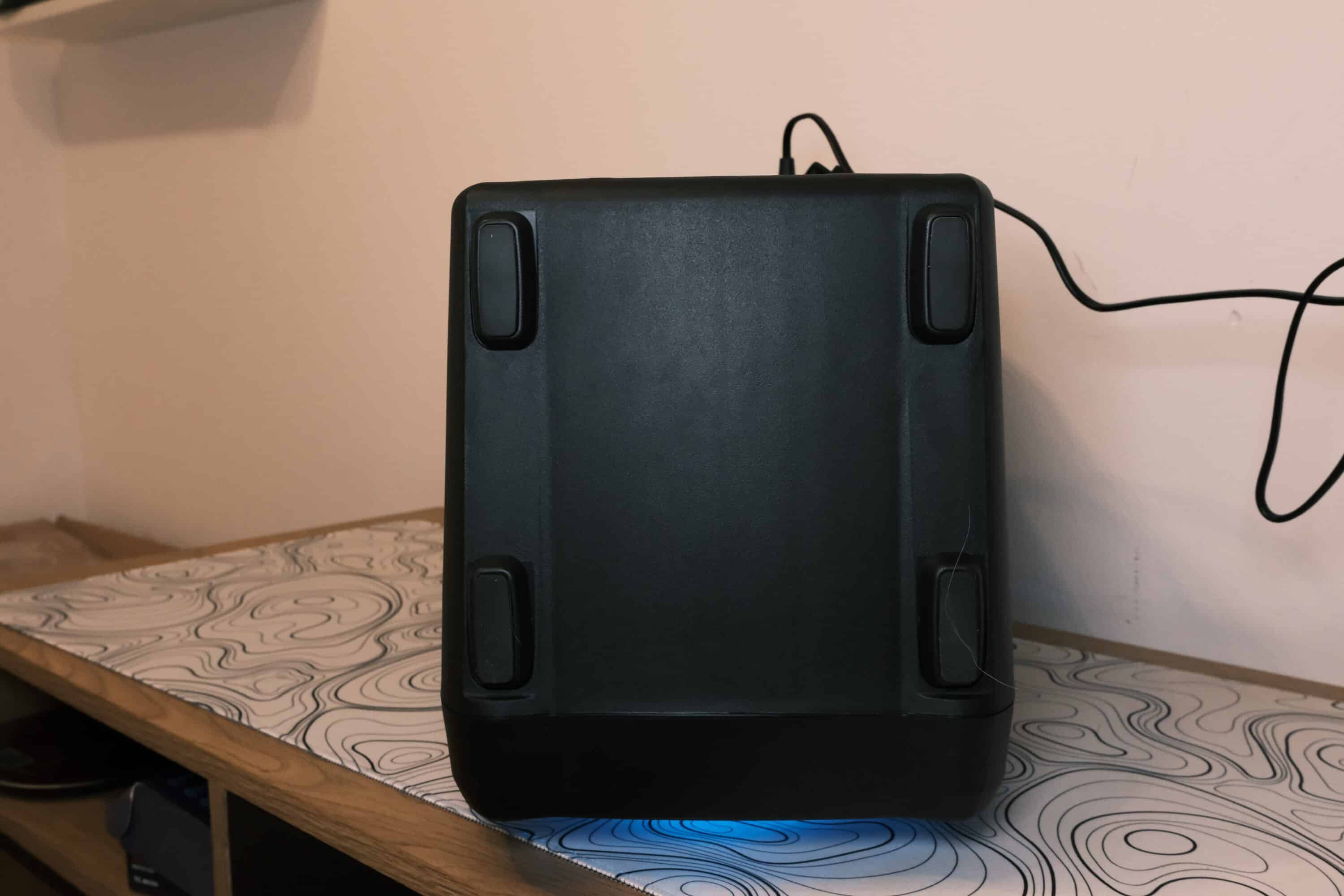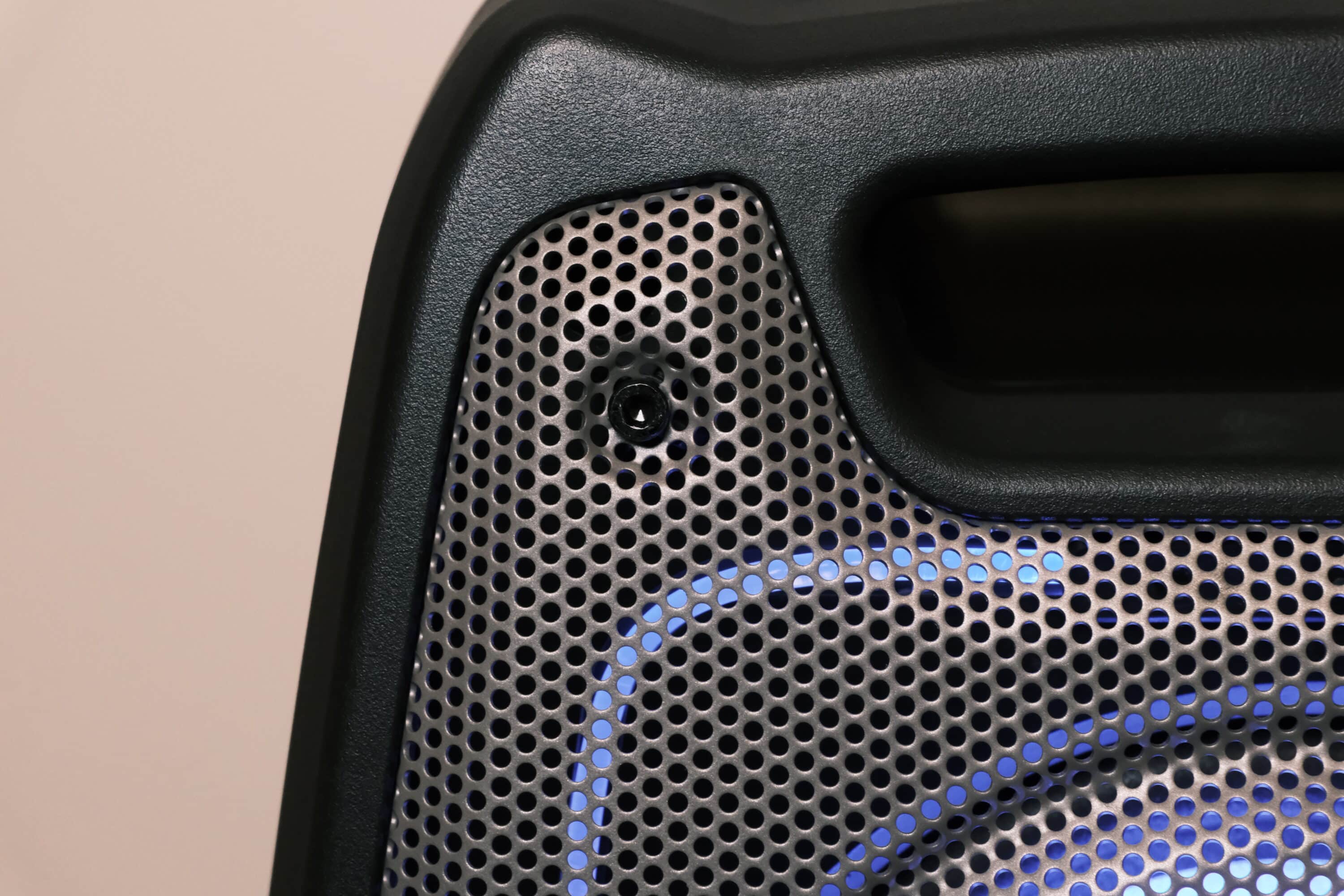 Der Lautsprecher setzt zwar auf ein mattes Kunststoffgehäuse, fühlt sich aber dennoch absolut robust und wertig an. Lediglich an der Oberseite zeigen sich einige kleinere Ungereimtheiten bei den Übergängen, wirklich störend ist das aber nicht. Die Treiber sind zudem durch ein Metallgitter geschützt, das sich mithilfe eines Innensechskantschlüssels auch abnehmen ließe.