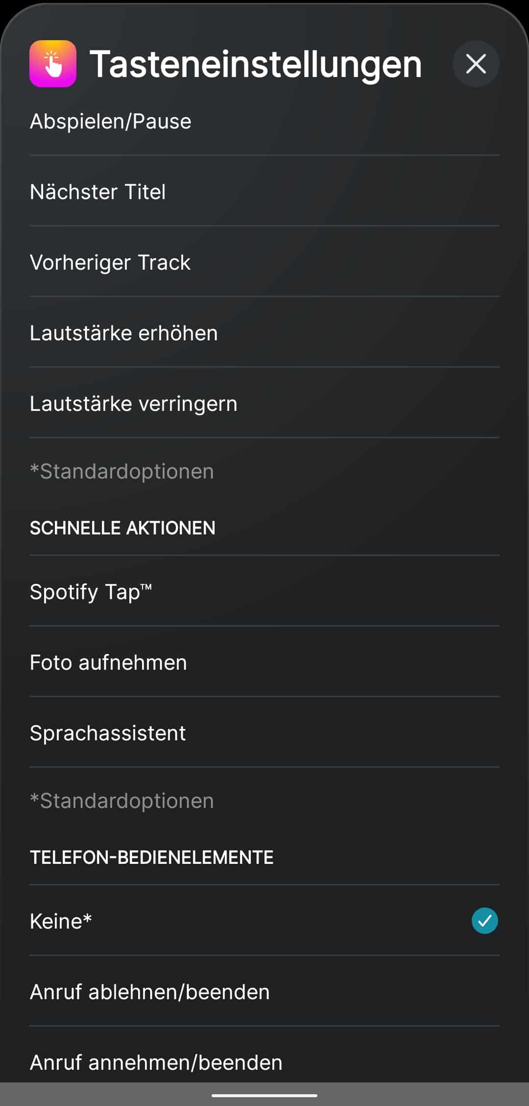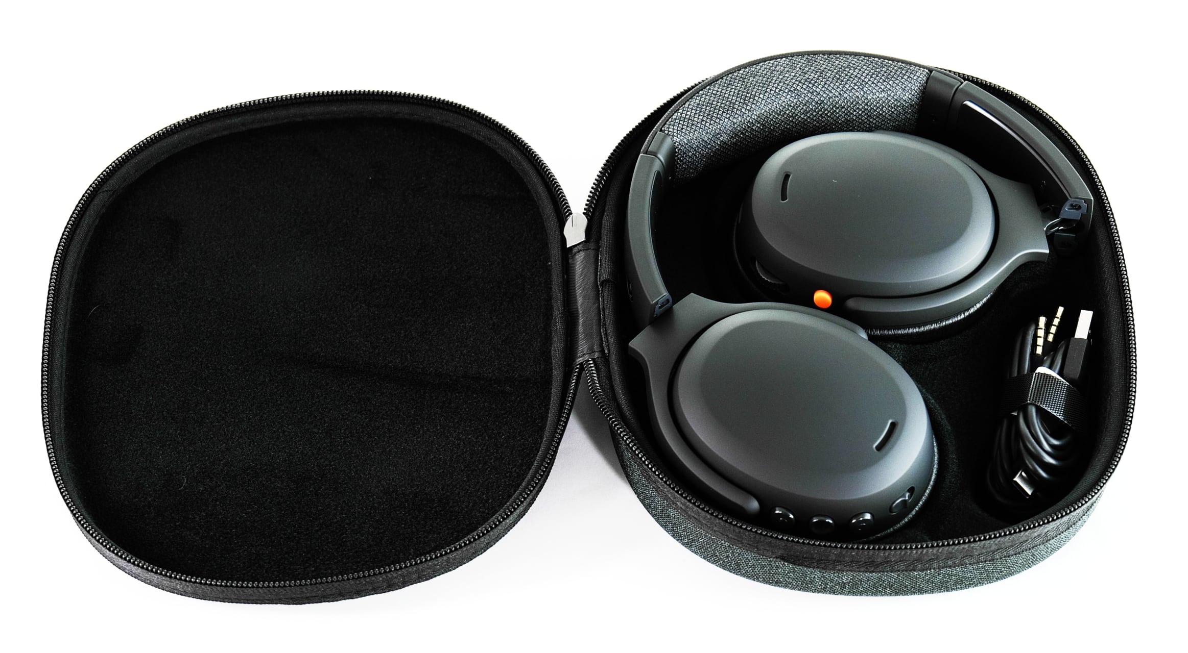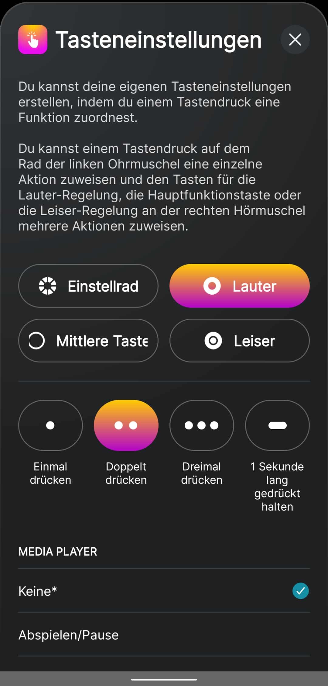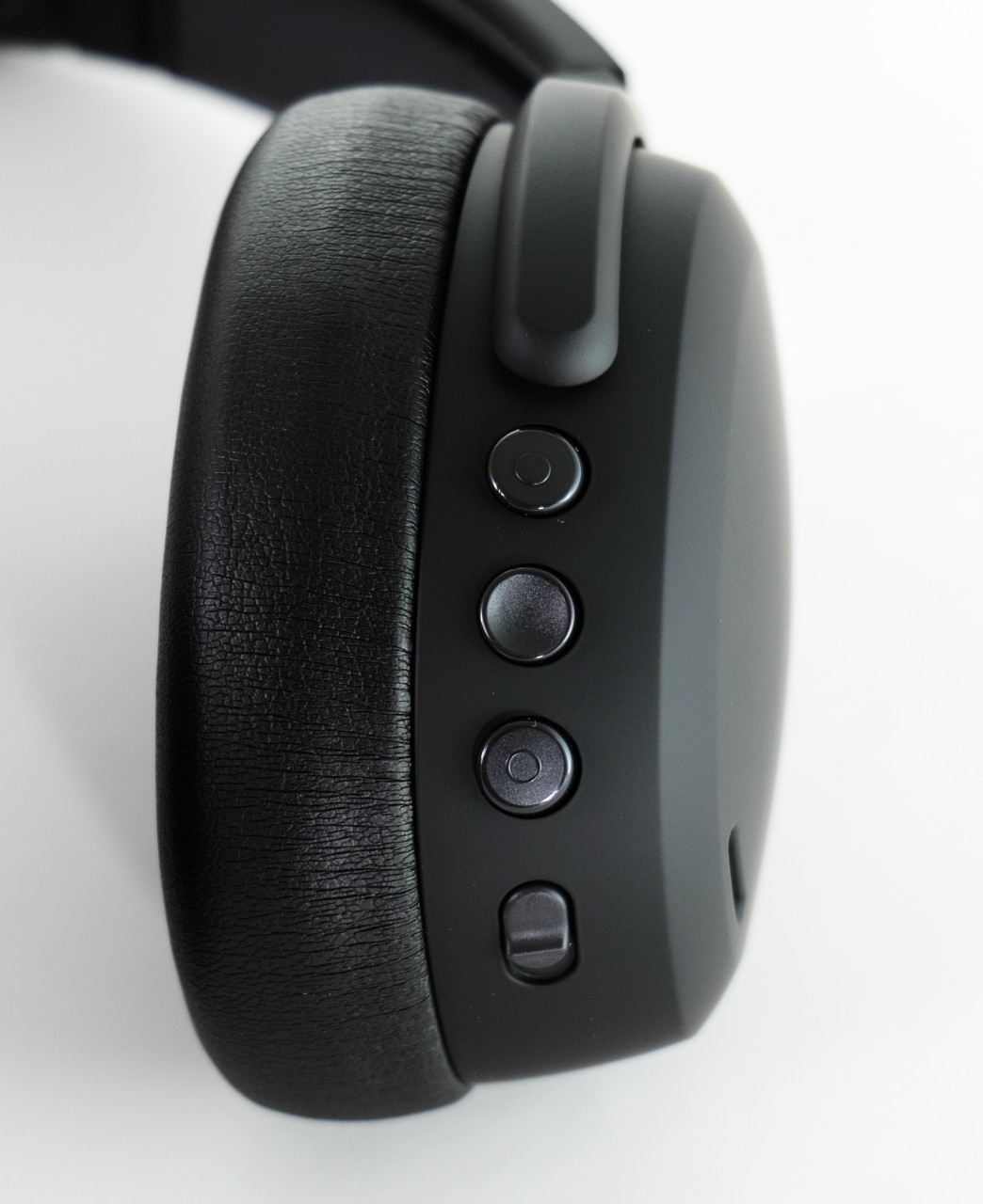 Weitere Bedienelemente befinden sich an der rechten Ohrmuscheln. Dort sind die üblichen drei Multimediatasten und ein Schiebetaster untergebracht, mit dem man ANC und Transparenzmodus (de-)aktivieren kann. Der Schiebetaster sieht dabei zwar wie ein Schalter aus, der Knopf bewegt sich aber selbstständig in seine Ausgangsposition zurück. So sollen wohl Fehlbedienungen verhindert werden.