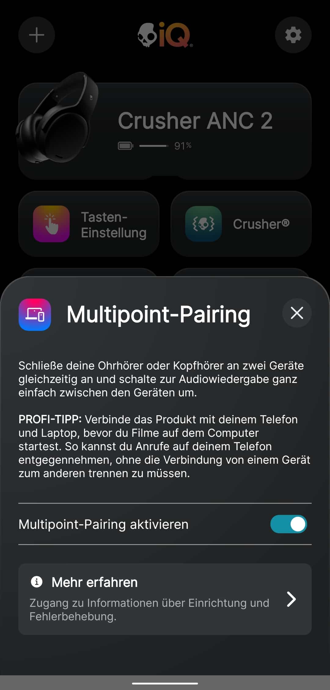 Bei den Zusatzfunktionen wirbt Skullcandy mit dem vollen Paket: ANC, Transparenzmodus und einer eigenen App. Die Umsetzung dieser Funktionen hat uns dabei gut gefallen: Der Transparenzmodus sowie ANC werden wie meist von einem leichten Grundrauschen begleitet, das ist bei Musikgenuss aber nicht störend. Die Unterdrückung von Fremdgeräuschen funktioniert zudem gut: Einige wenige Kopfhörer schlagen sich noch besser, mit der großen Masse können die Crusher ANC 2 aber problemfrei mithalten. Beeindruckend ist zudem die Akkulaufzeit. Bei vollem Bass und aktiviertem ANC hielten die Hörer ganze 46 Stunden Dauerbetrieb bei Zimmerlautstärke durch.