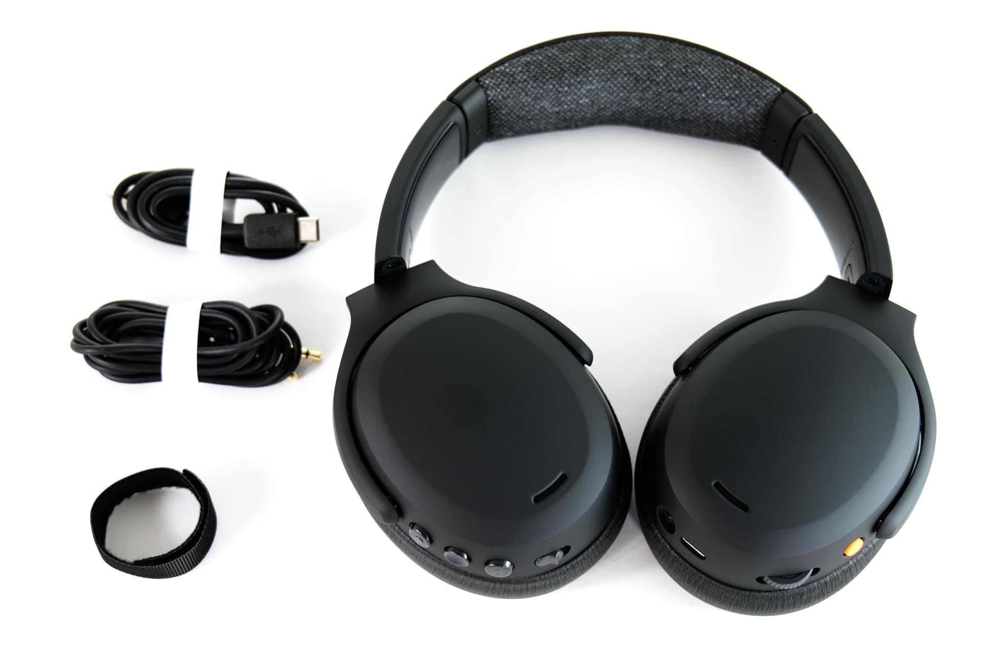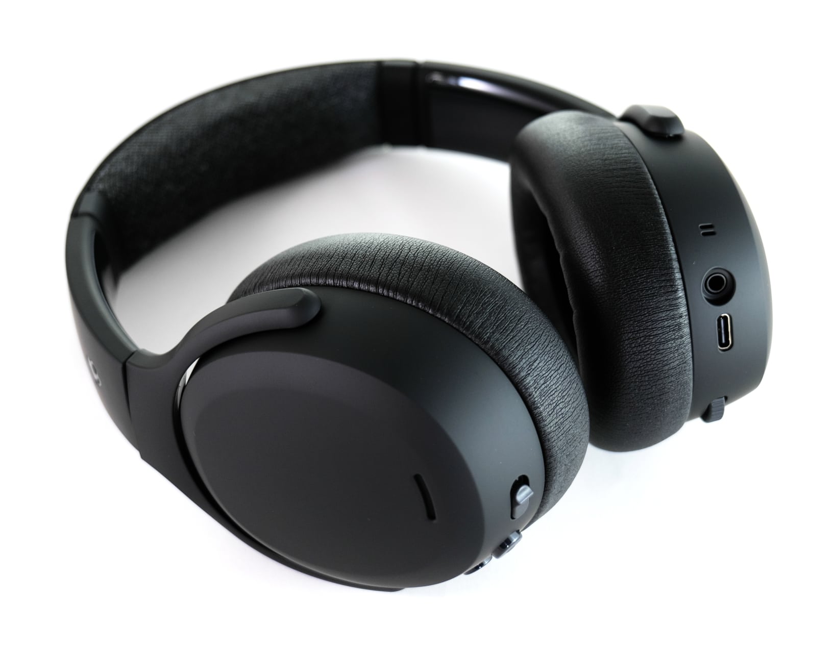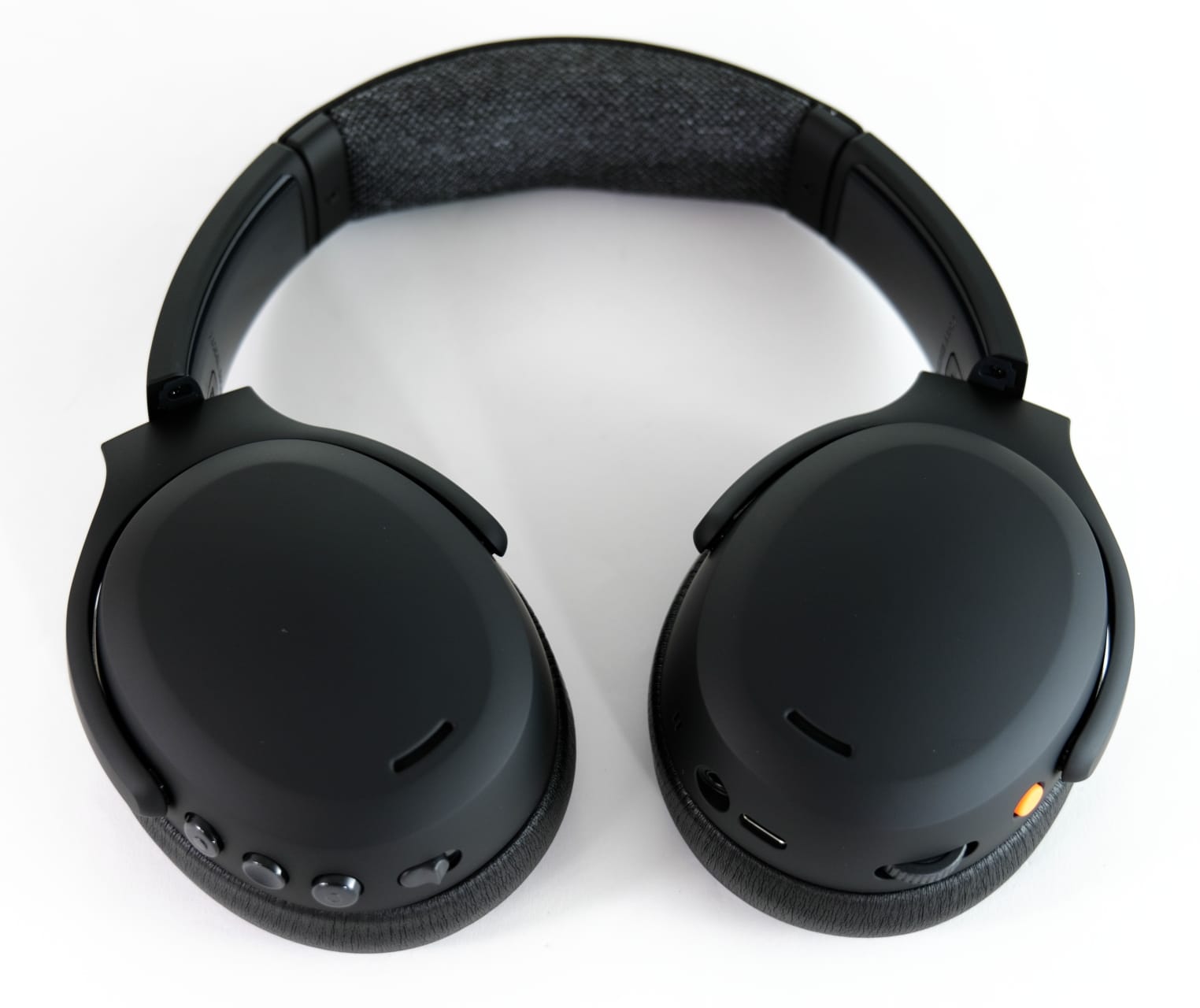 Skullcandy folgt mit den Crusher ANC 2 der üblichen Bauweise: Die Chassis sind in zwei dreh- und neigbar gelagerten Ohrmuscheln, die seitlich die Bedienelemente beinhalten. Verbunden werden die Muscheln über einen ausziehbaren Kopfbügel. Die Berührung mit dem Kopf erfolgt dabei durch ein Kopfpolster aus Stoff und Ohrpolstern mit Kunstlederbezug. Innen im Kopfbügel kommt zudem Metall zum Einsatz, der Rest der Kopfhörer besteht hingegen aus schwarzem Kunststoff. An den meisten Stellen ist dieser Mattschwarz gehalten, zur Innenseite hin sind einige Flächen hingegen hochglänzend.
