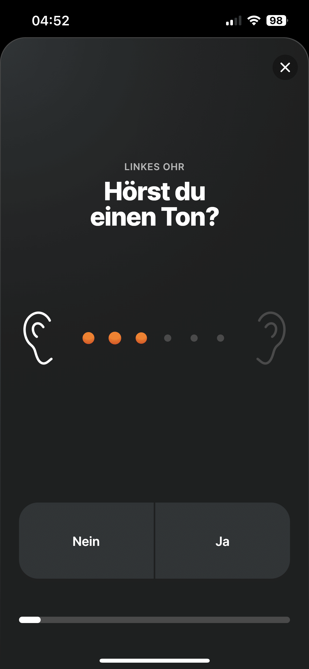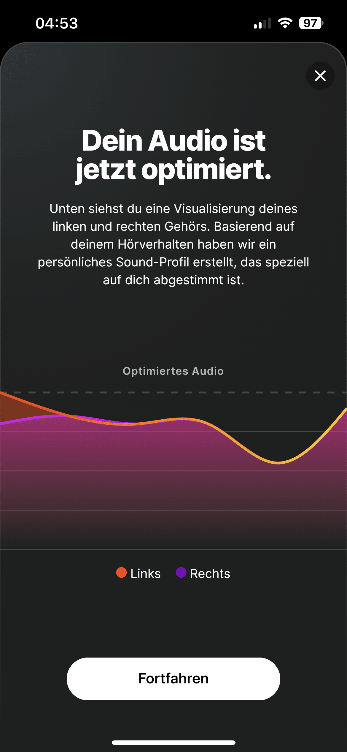 Zusätzlich kannst du in der App einen Hörtest durchführen. Nach und nach werden für das linke und dann für das rechte Ohr verschiedene Tonfrequenzen abgespielt, anhand dessen der Klang auf dein Gehör abgestimmt wird.