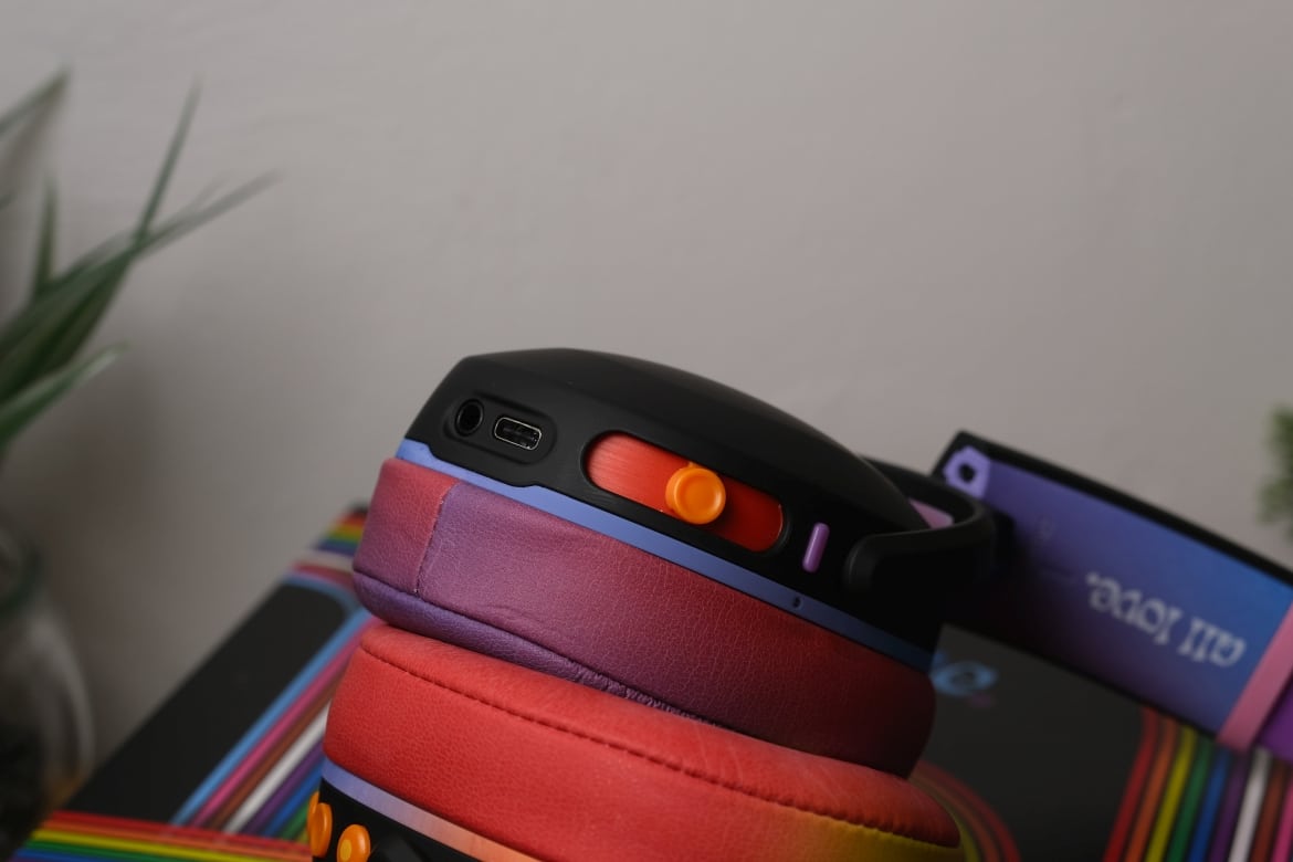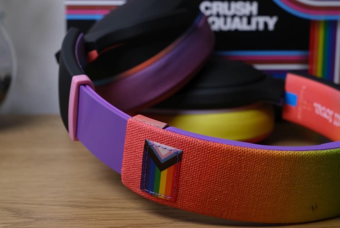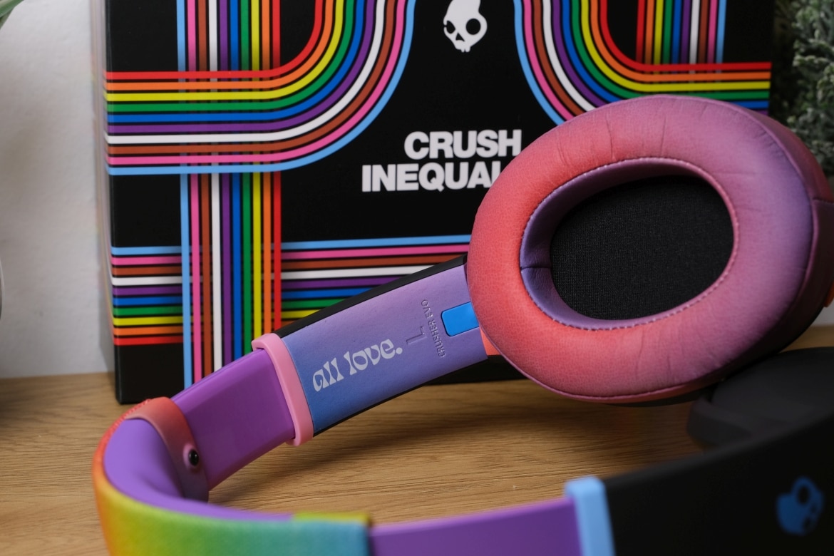 Hinsichtlich des Designs sei zunächst angemerkt, dass uns der Hersteller die farbenfrohe „All Love“-Sonderedition zur Verfügung gestellt hat. Die kommt mit quietschbunten Ohrpolstern, Kopfband und Knöpfen daher. Normalerweise gibt’s die Crusher Evo aber auch in dezentem Schwarz und Grau.