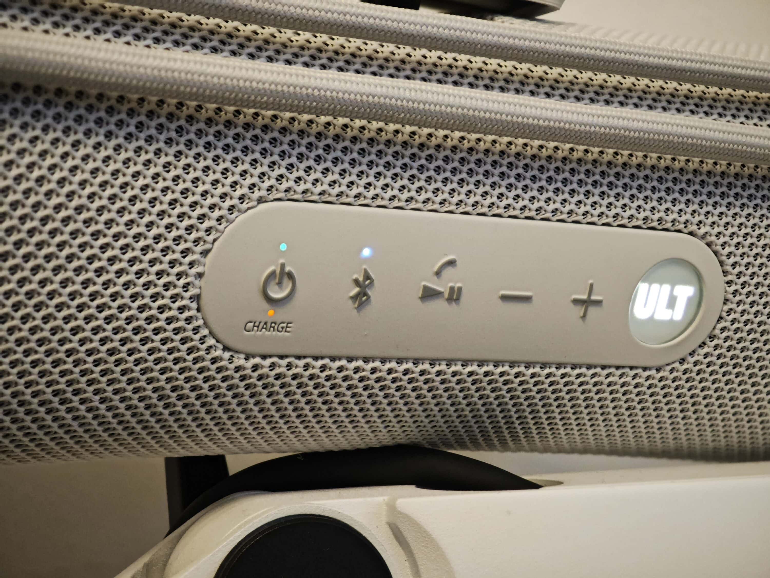 Die Bedienelemente teilt der Sony ULT Field 1 mit seinem größeren Geschwisterchen ULT Field 7. Links findet ihr den Power-Button samt Status- und Lade-LED, daneben die Bluetooth-Taste, während Play/Pause, sowie die Lautstärke-Tasten die Elemente abrunden.