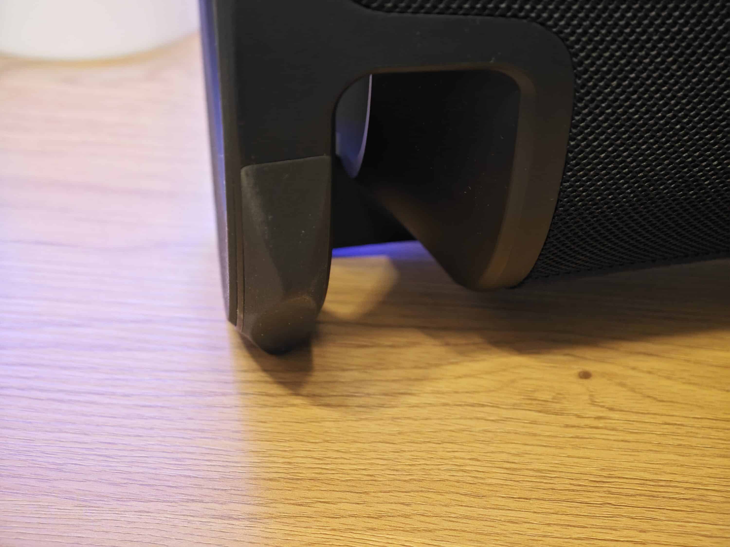 Er verfügt über eine IP67-Zertifizierung als Schutz vor Staub und Wasser und ist designt, um horizontal auf Oberflächen Platz zu nehmen. Allerdings kann er auch vertikal aufgestellt werden. In der Horizontale gibt es dafür abgerundete Gummifüße an der Unterseite, durch die der Bluetooth-Lautsprecher gerade aufliegt.