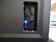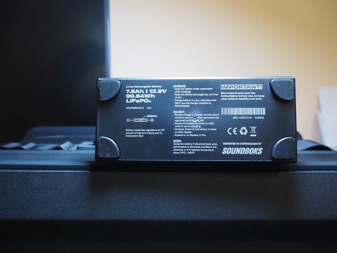 Knapp 100 Wattstunden ist der herausnehmbare Akku der Soundboks Go groß. Er verfügt in der oberen linken Ecke über einen Knopf, der anhand der darunter befindlichen LED-Balken über den Ladestand informiert. Insgesamt fünf Balken informieren über die Laufzeit, jeder davon steht also für 20 Prozent Leistung.