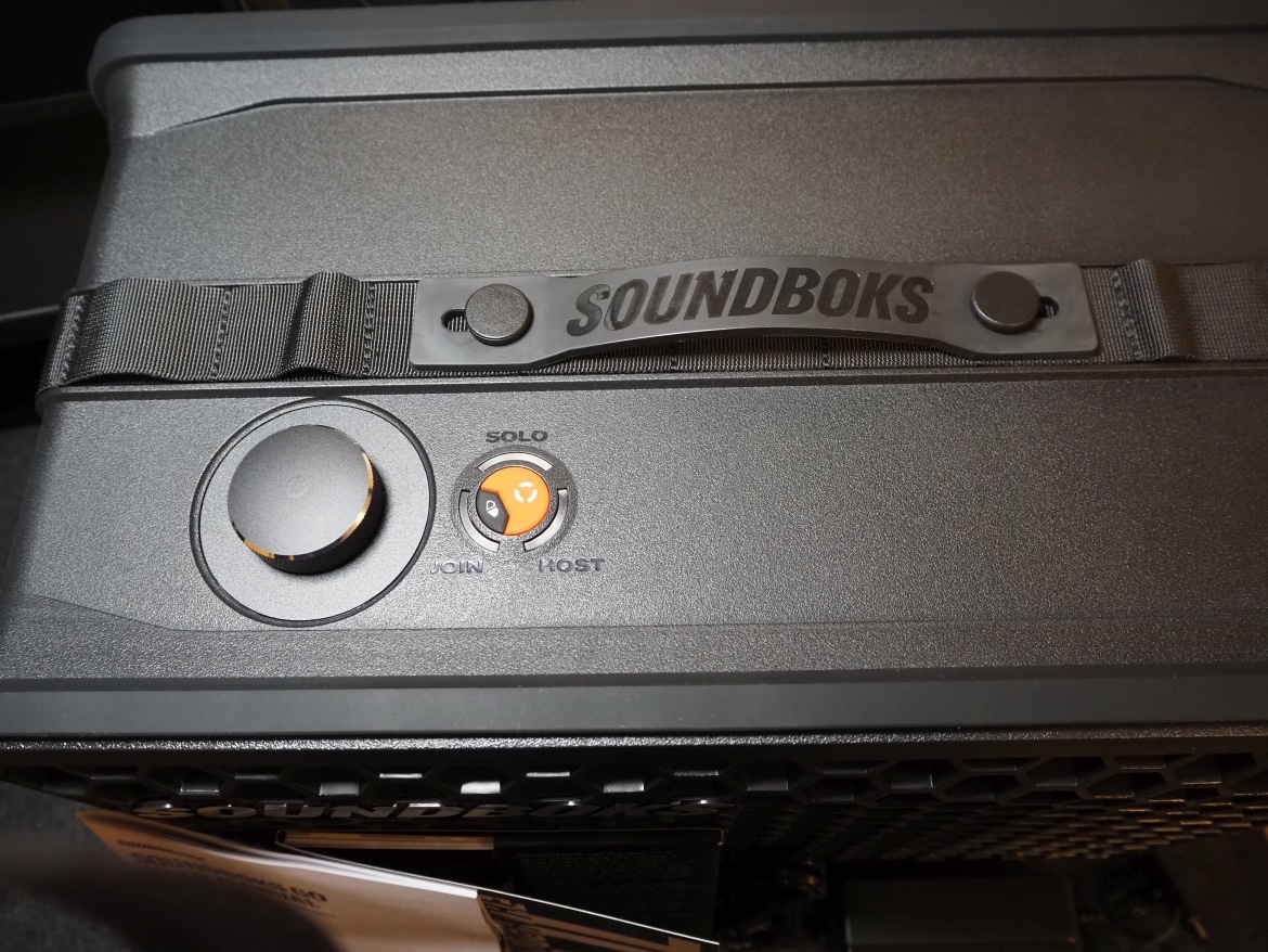 Per Druck auf das Lautstärkerad wird die Soundboks Go eingeschaltet. Dabei ist der Regler von einem LED-Rad umgeben, das Hersteller-typisch die Lautstärke in maximal elf Stufen reguliert und anhand von blauen Strichen darstellt. Unterhalb des Drehreglers informiert ein Bluetooth-Symbol über die aktive Verbindung.