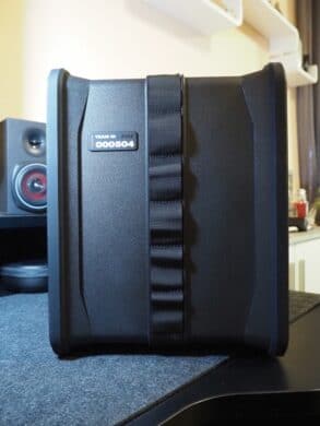 Die Vorderseite wird dabei von großen Hexagon-Öffnungen geziert, die einen Blick in die dahinterliegende Elektronik ermöglichen. Auf der rechten Seite erspähen wir den gewaltigen, 10 Zoll großen Tieftöner, dem links daneben der Seidenkalotten-Hochtöner mit einem Durchmesser von einem Zoll zur Seite steht. Oben links prangt das Hersteller-Logo in silberner Schrift.