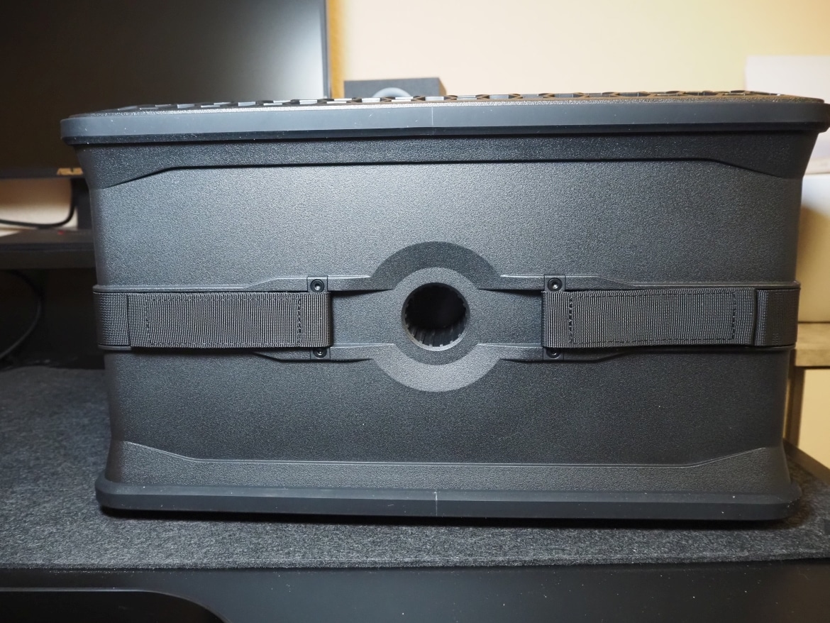 Ein Blick auf die Rückseite offenbart dabei lediglich ein interessantes Element, denn dort ist das herausnehmbare Batteryboks-Akkupack zu finden, das mit einer Trageschlaufe einfach zum Laden aus dem Gehäuse genommen werden kann. Die Unterseite hingegen bietet mit Ausnahme des großen Lochs in der Mitte, mit dem die Soundboks Go auf einem Tripod-Stand positioniert werden kann, ebenfalls wenig Spannendes.