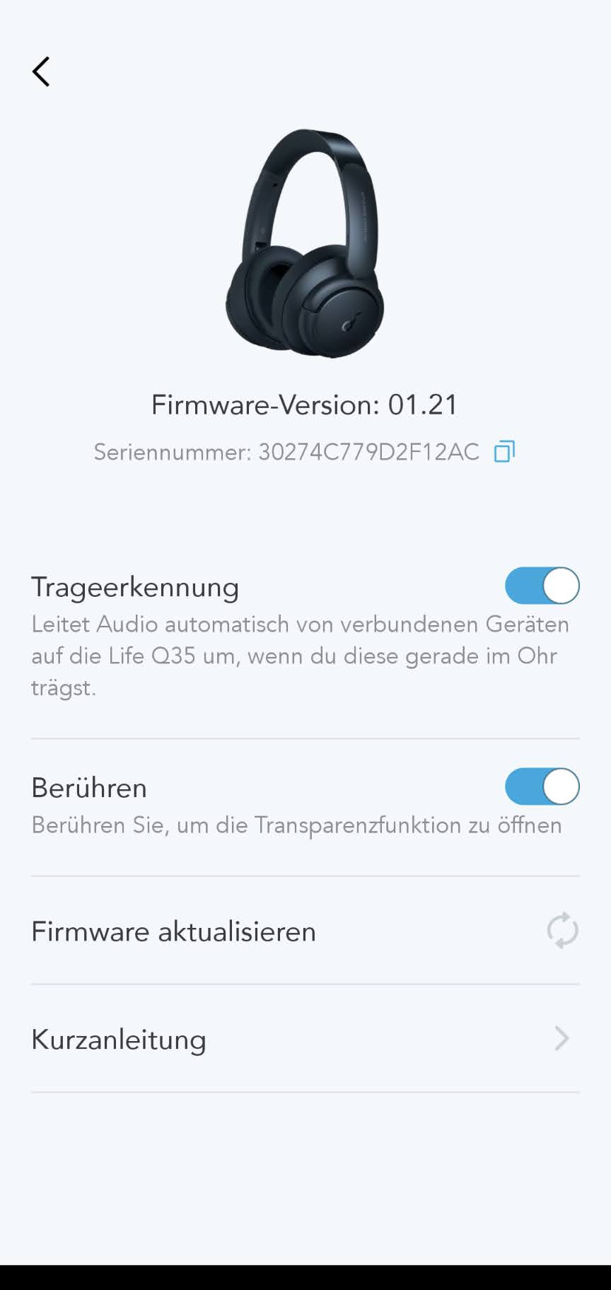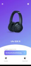 Über ein längeres Drücken der Ein-/Aus-Taste gelangt man in den Bluetooth-Kopplungsmodus. Anschließend lassen sich die Soundcore Life Q35 am gewünschten Gerät auswählen und verbinden. Ein weiteres Gerät kann mittels zweifachem Drücken auf die Ein-/Aus-Taste gekoppelt werden. Noch einfacher gestaltet sich das Koppeln mit Hilfe von NFC. Hiermit reicht es, wenn man das Smartphone nah an die rechte Seite der Kopfhörer hält.