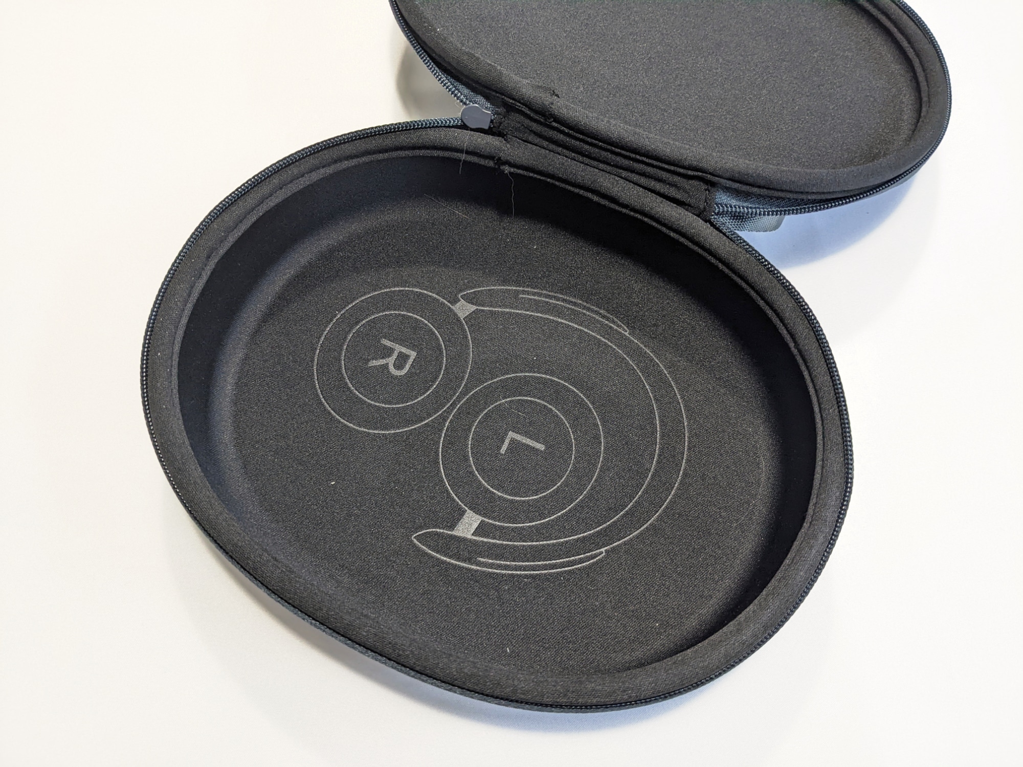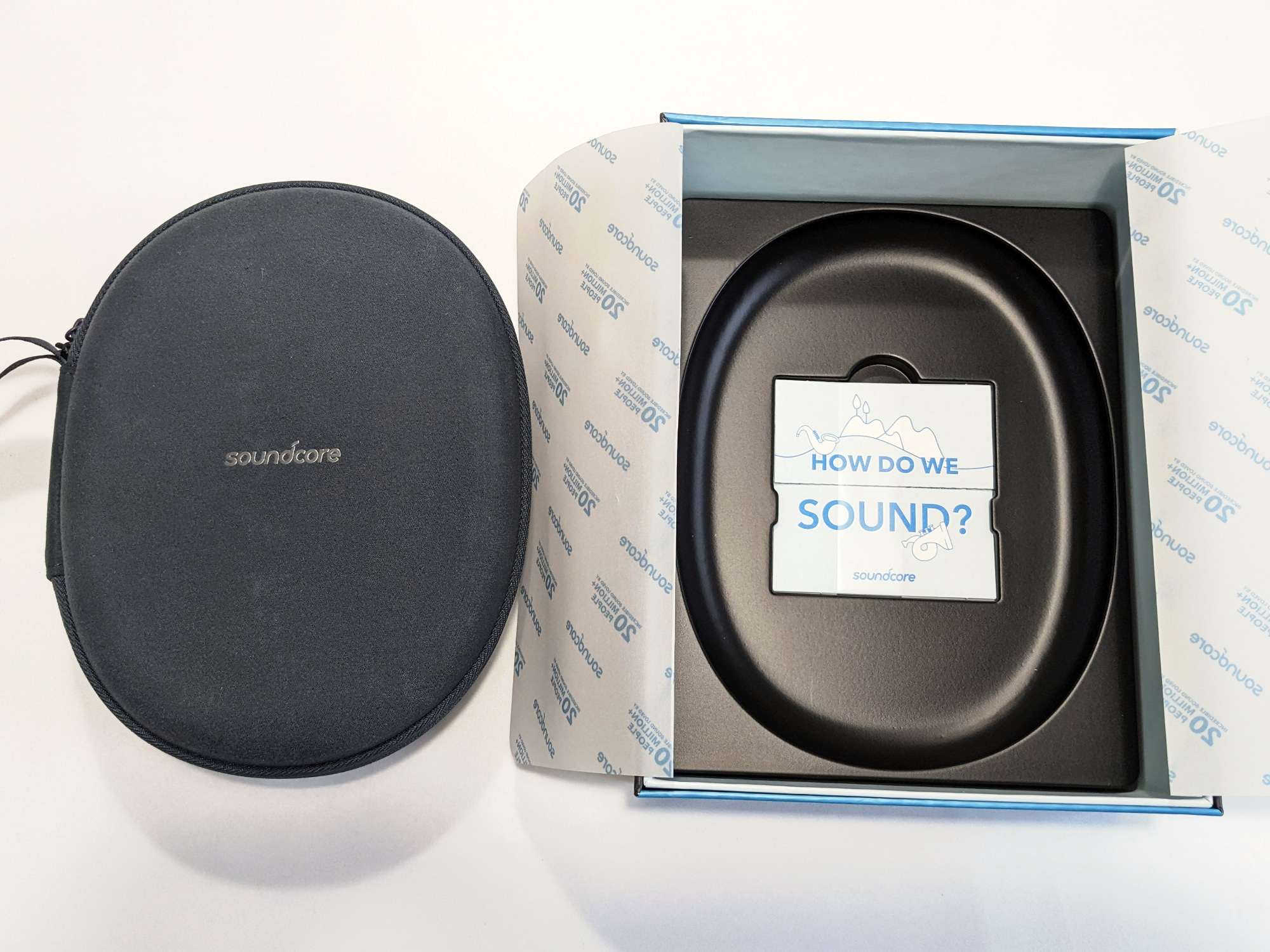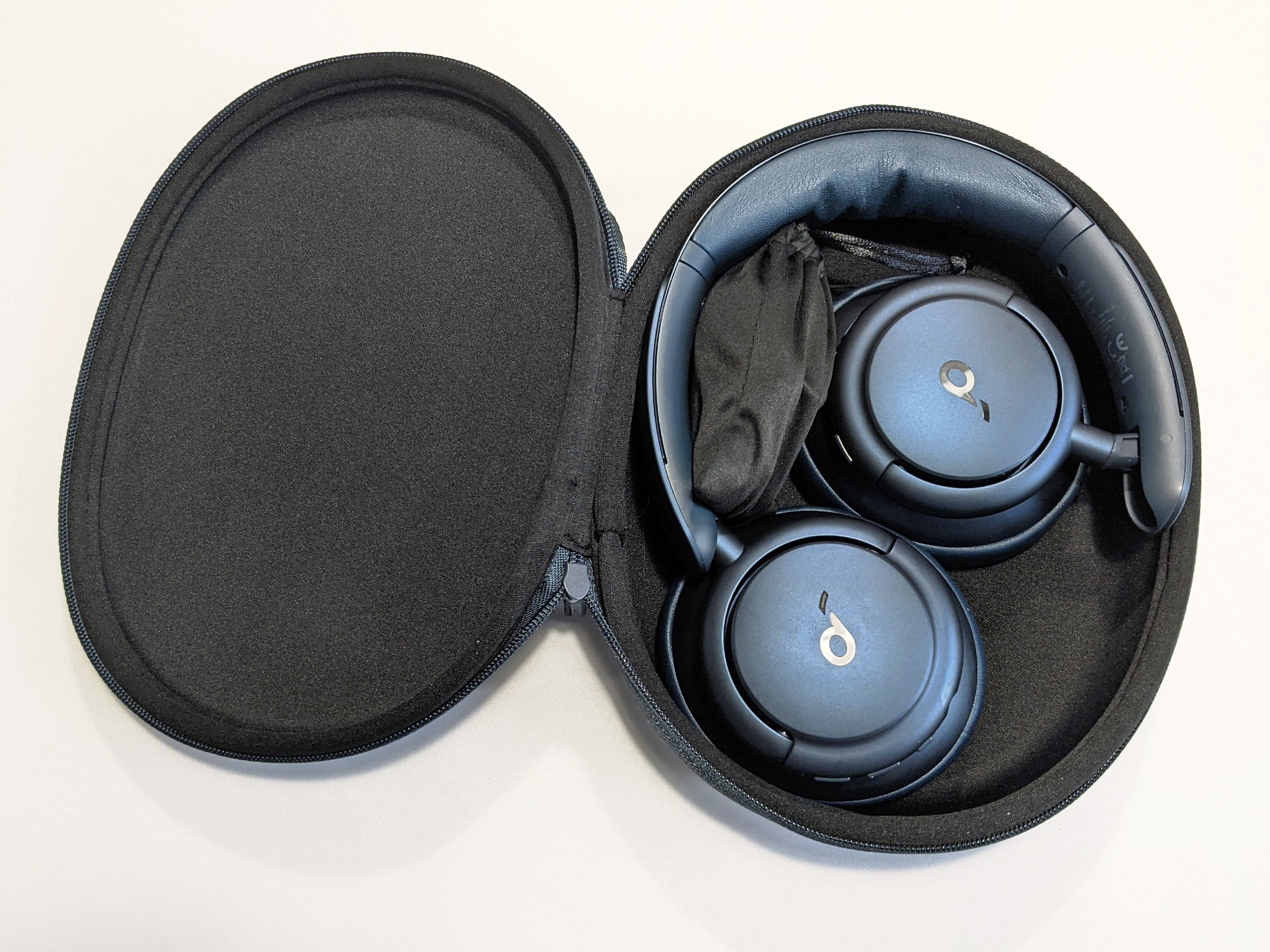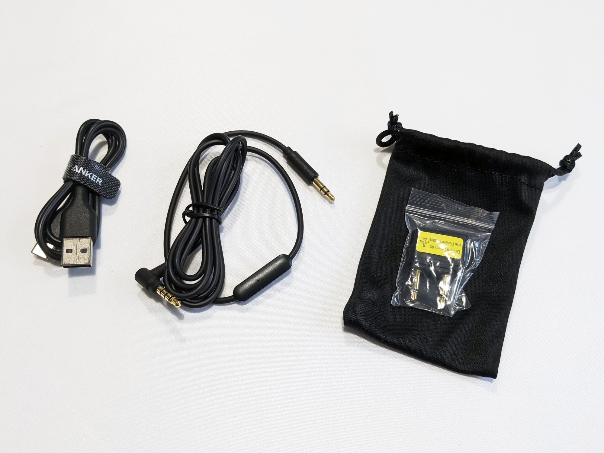 Soundcore liefert die blaue Variante der Kopfhörer zusammen mit einem graublauen Etui aus. Dieses hinterlässt einen guten Eindruck und bietet im Inneren ausreichend Platz für die Kopfhörer, welche eingeknickt und mit um 90° gedrehten Ohrmuscheln verstaut werden, und Kabel. Eine Unterteilung bzw. ein separates Fach für letztere findet man allerdings nicht vor. USB-C-Ladekabel und Klinkenkabel sind stattdessen in einem kleinen Stoffbeutel untergebracht. In diesem befindet sich außerdem auch ein Flugzeug-Adapter. Der Lieferumfang ist damit sehr umfangreich und bietet alles, was man in dieser Preisklasse erwarten kann.