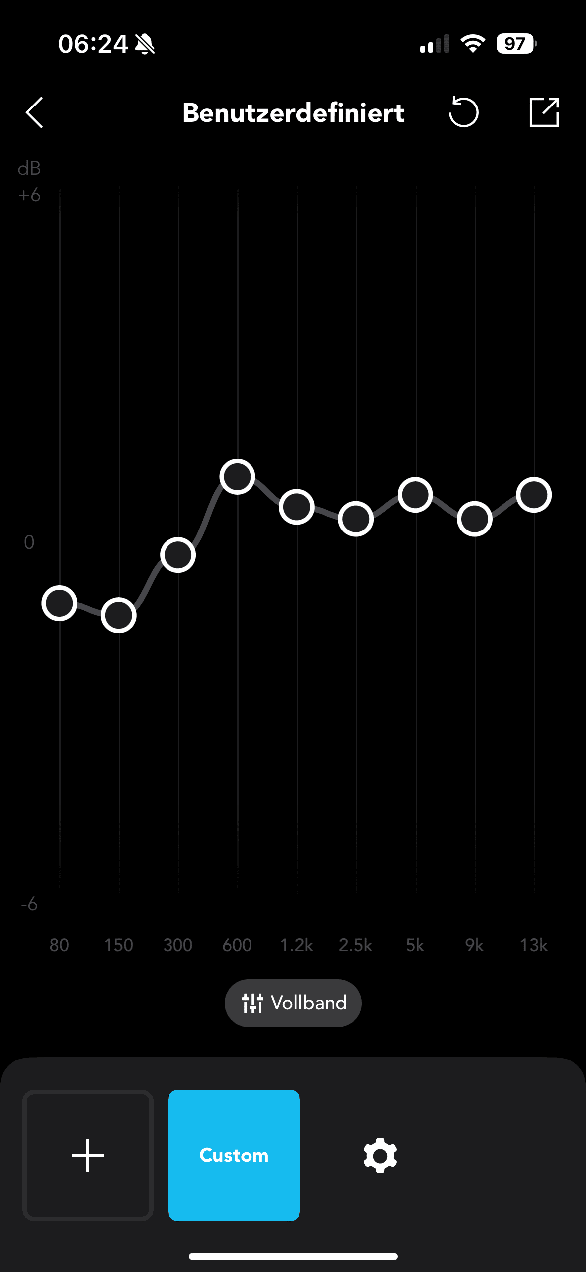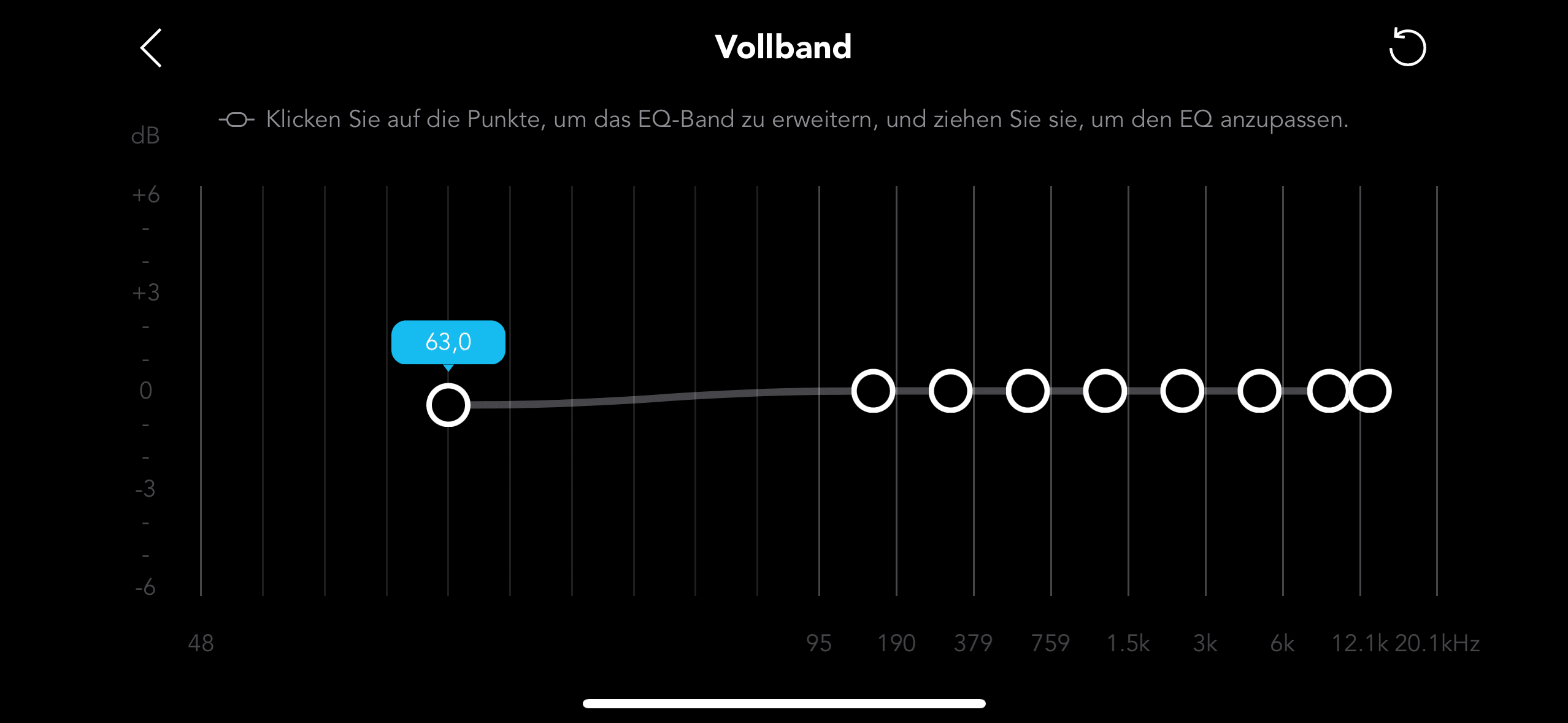 Andererseits kannst du zwischen vier Equalizer-Presets wählen oder dir selbst anhand eines 9-Band-EQ eigene Klangprofile zusammenschustern. Im Vollband-Modus können die eigenen Bänder sogar hinsichtlich der Frequenz verschoben und noch weiter individualisiert werden.