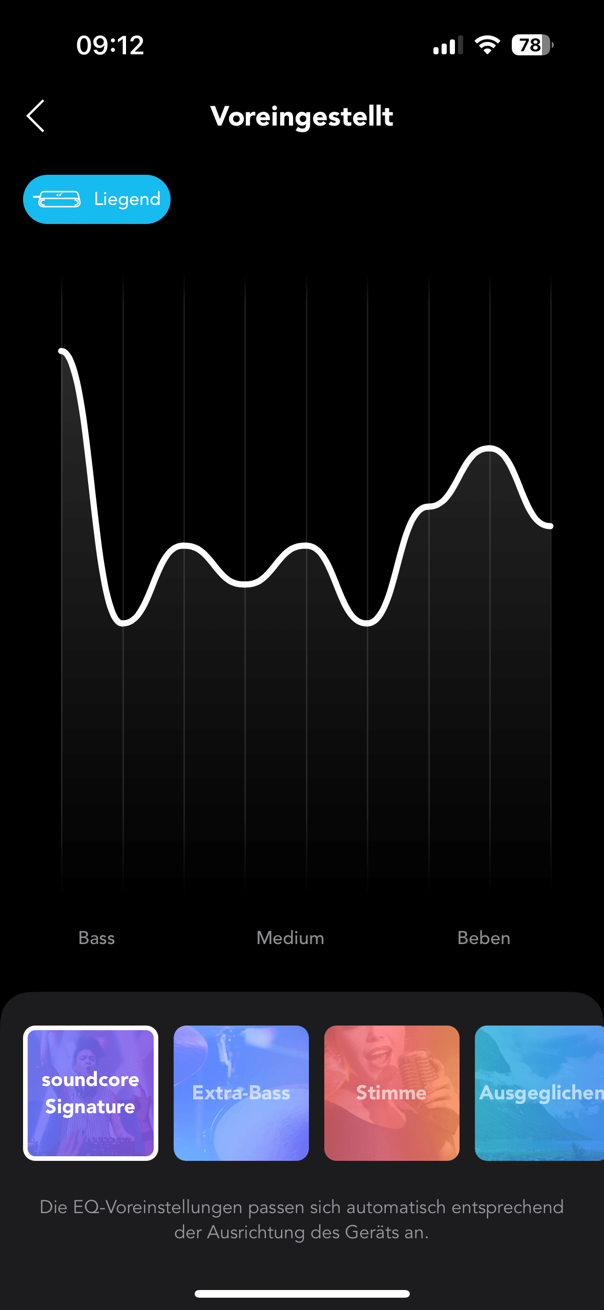 Wirklich interessant wird es jedoch hinsichtlich der Equalizer-Einstellungen. Einerseits kannst du hier die adaptive Ausrichtung deaktivieren (denn der soundcore Motion 300 erkennt automatisch, ob er stehend, liegend oder hängend verwendet wird).