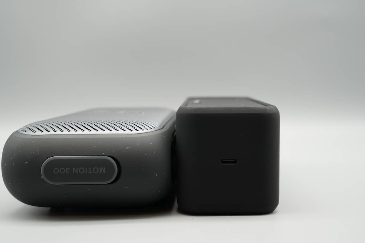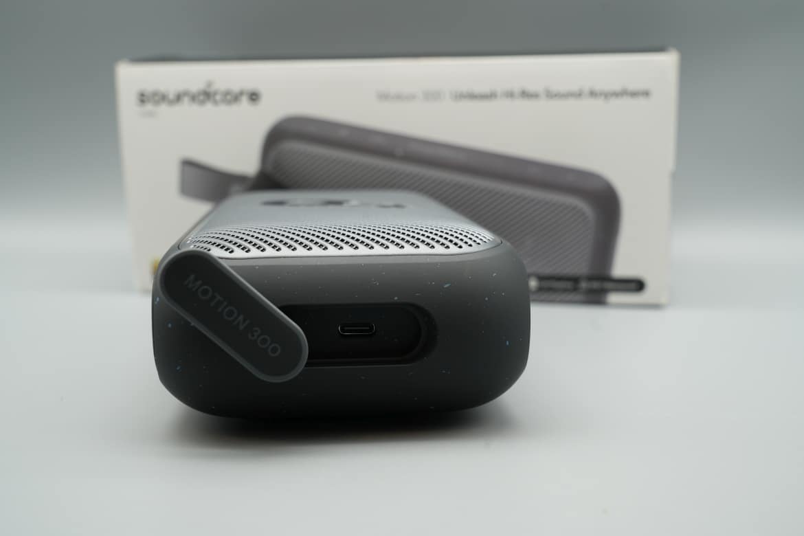 Auf der rechten Seite versteckt man, unter dem „soundcore 300“-Schriftzug, den USB-C-Ladeport des wasserresistenten Speakers. Unten und an der Rückseite sorgen gummierte Standfüße für einen sicheren Halt auf jeglichen Oberflächen. Optisch gefällt mir der Lautsprecher, der ein wenig an den Bose Soundlink Flex erinnert, sehr gut.