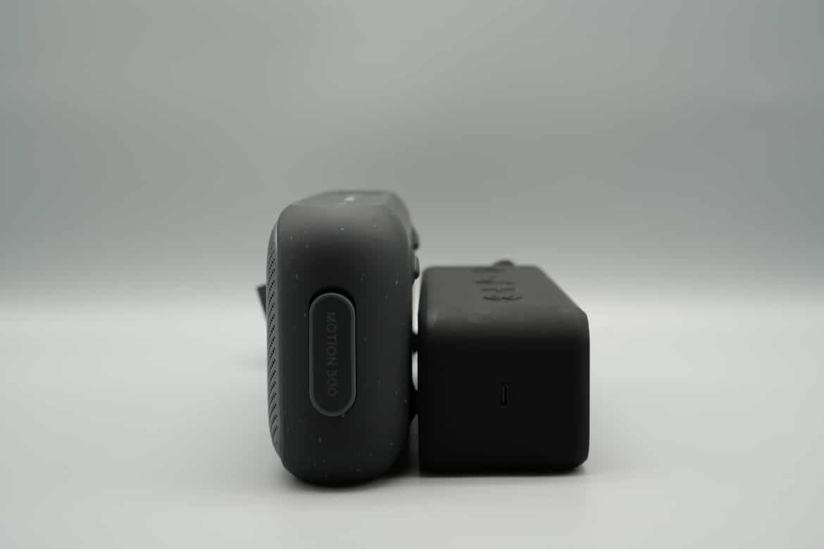 Mit Abmessungen von rund 200 mm x 92 mm x 50 mm (Breite x Höhe x Tiefe) ist der Motion 300 absolut Rucksack-tauglich und fällt mit einem Gewicht von 770 Gramm auch nicht zu schwer aus.