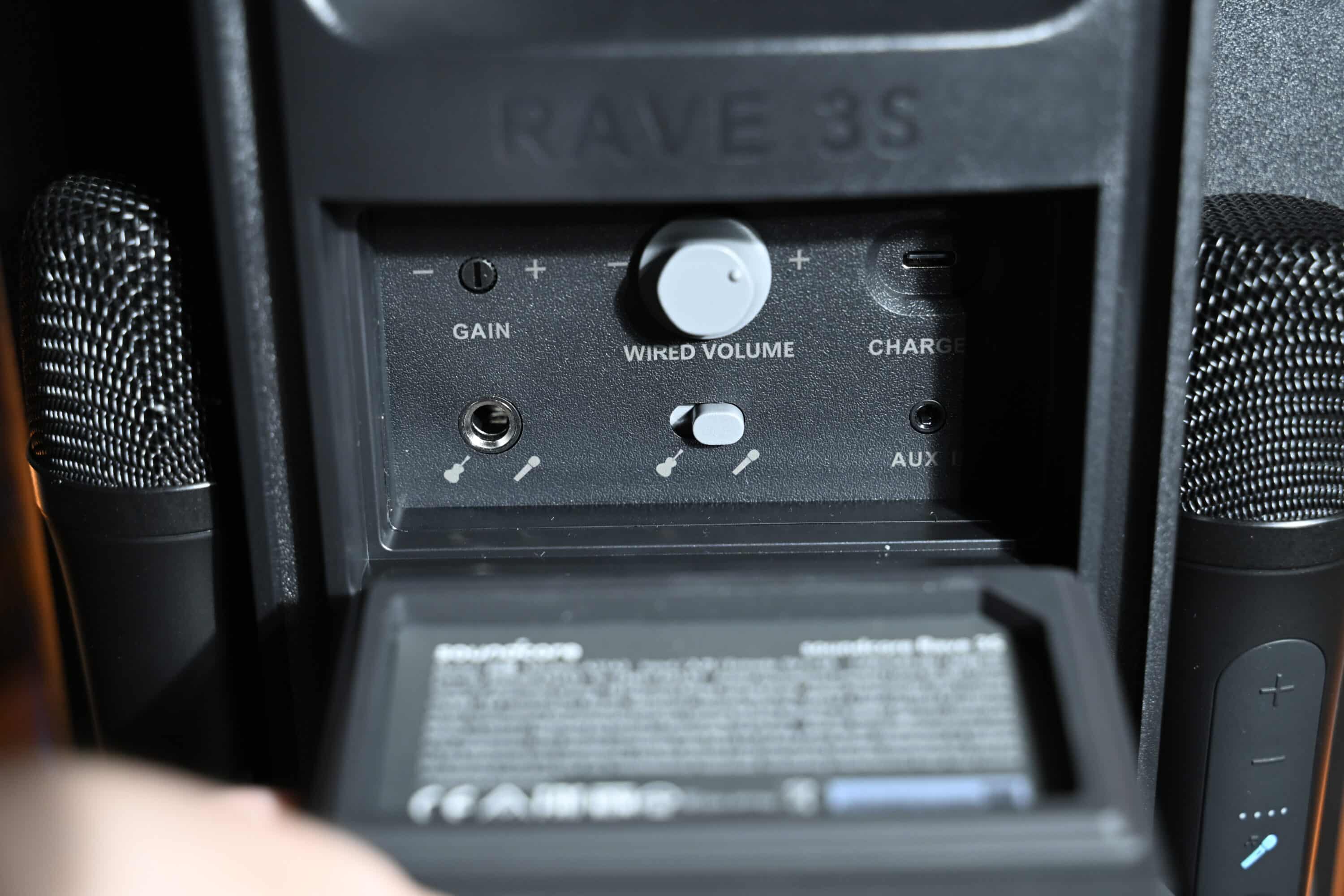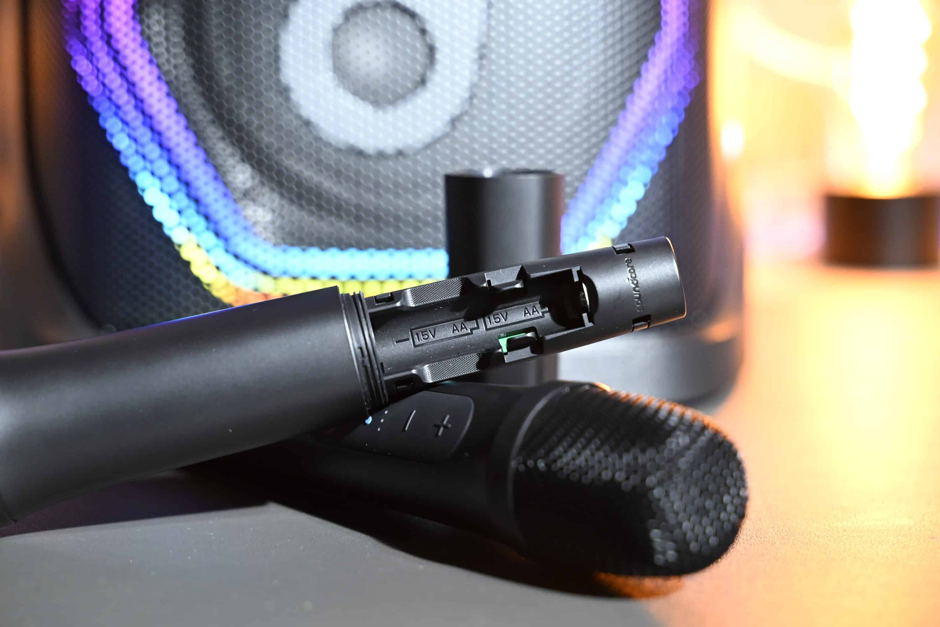 Da der soundcore Rave 3S über eine Karaoke-Funktion verfügt, spendiert der Hersteller dem Partylautsprecher gleich zwei kabellose Mikrofone, die einfach an der Rückseite eingesteckt werden können. Diese werden mit zwei handelsüblichen AA-Batterien betrieben, von denen sich praktischerweise gleich vier im Lieferumfang befinden.