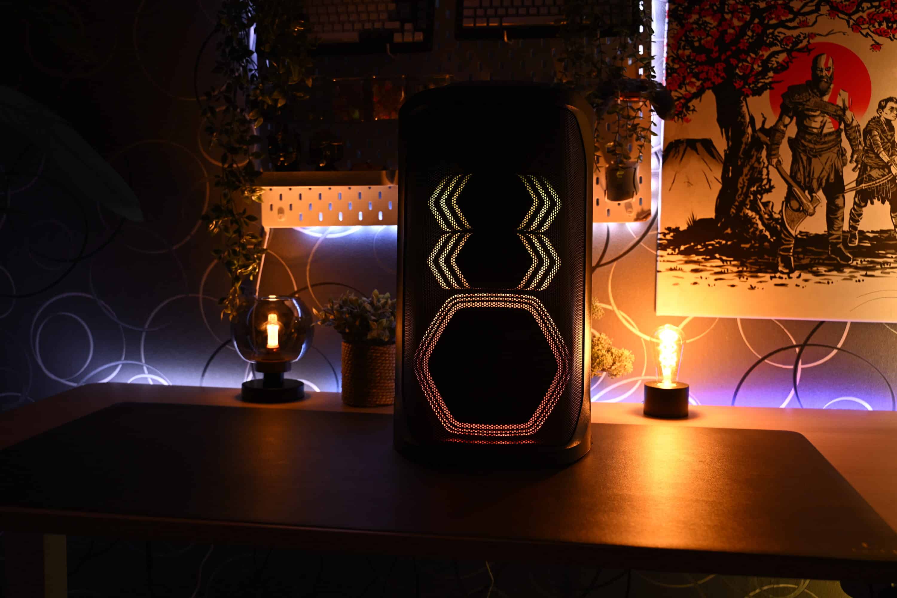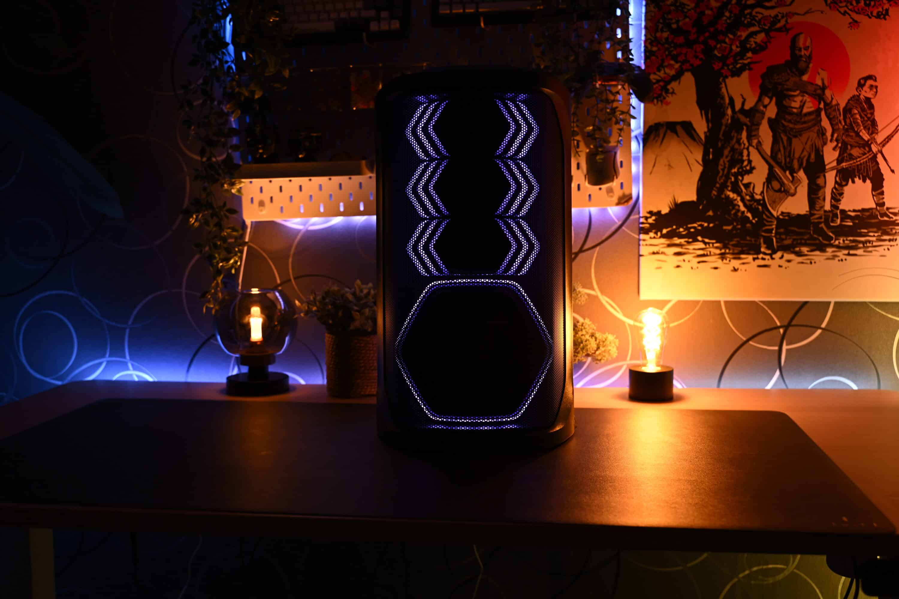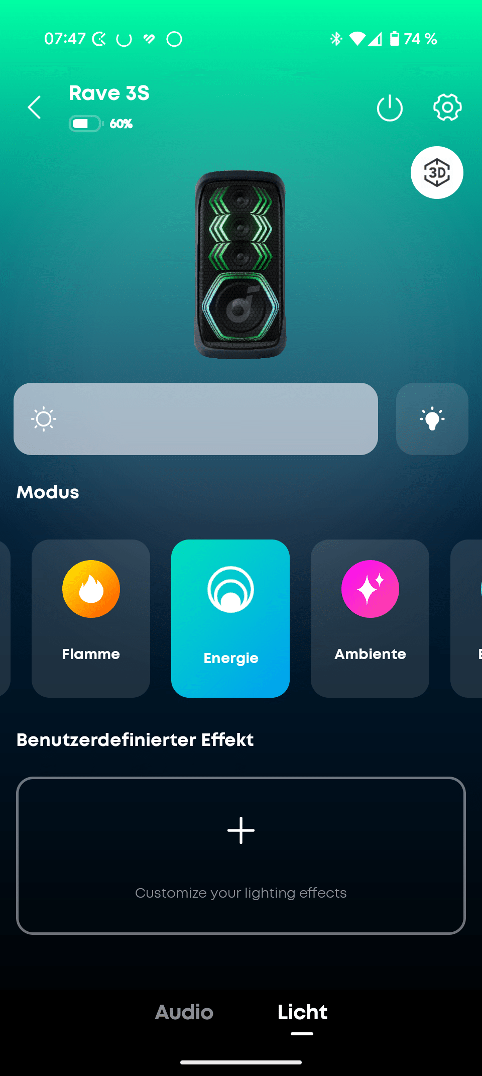 Was natürlich ebenfalls nicht fehlen darf ist eine schicke, anpassbare RGB-Beleuchtung. Diese erstreckt sich im Falle des soundcore Rave 3S auf die Bereiche unter dem Gitter, wobei das obere und das untere Licht in der Begleit-App individuell angepasst werden können. Hier stehen aber auch etliche vordefinierte Effekte zur Wahl.