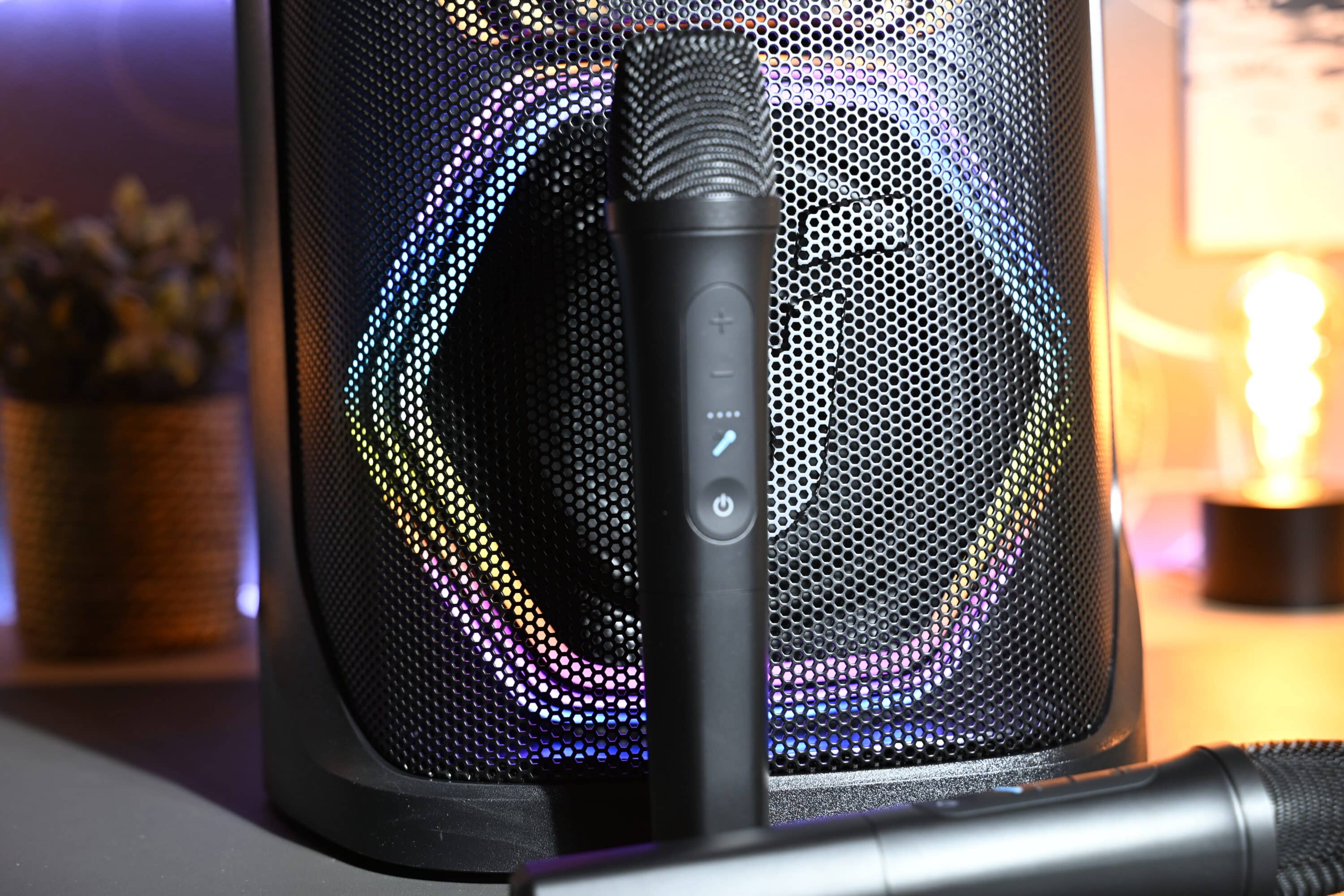 Wer gerne seine Lieblingssongs zum Besten gibt, kann den soundcore Rave 3S auch als Karaoke-Box nutzen. Wie bereits erwähnt finden sich dafür zwei kabellose Mikrofone im Lieferumfang, die nach dem Einschalten sofort gekoppelt sind.