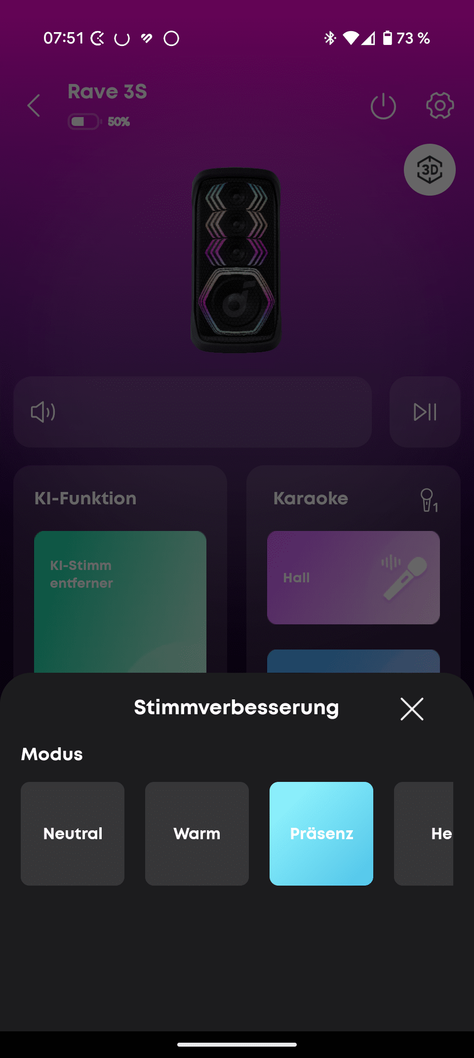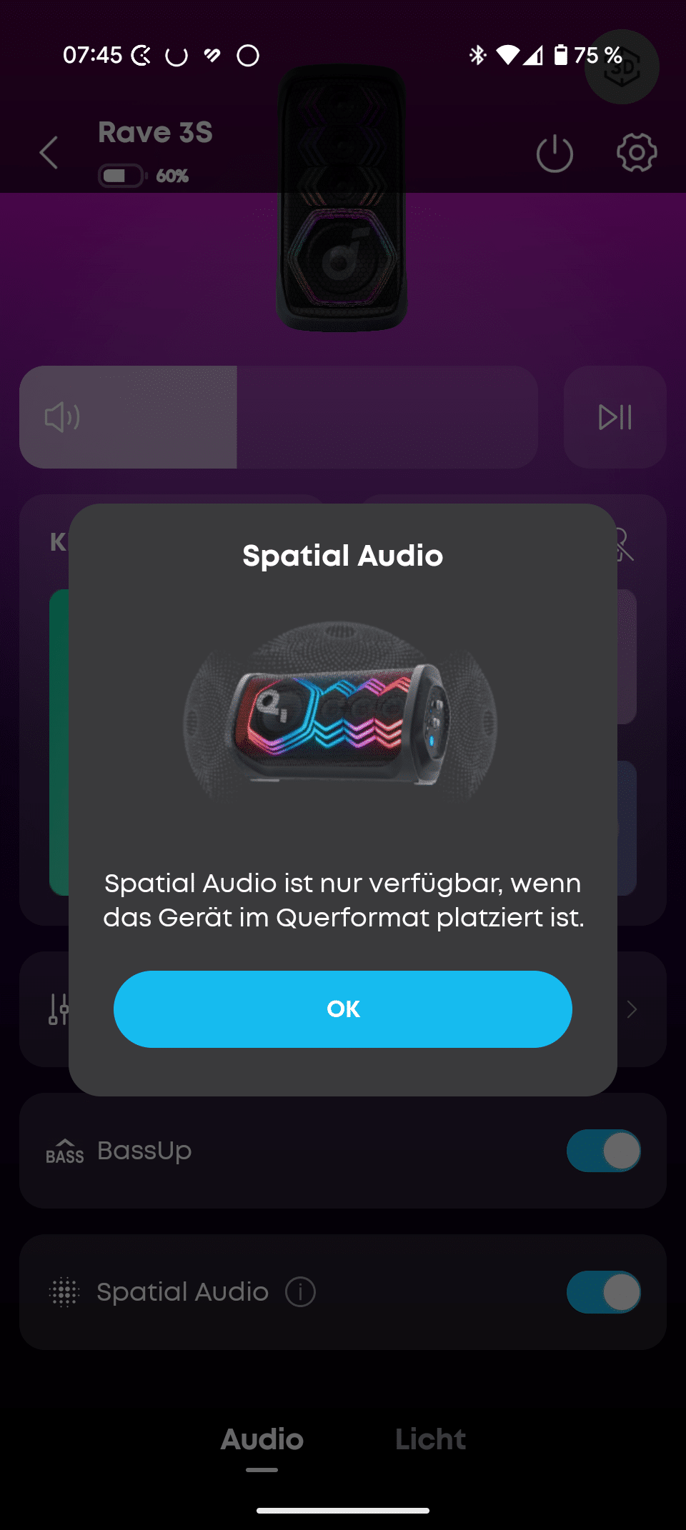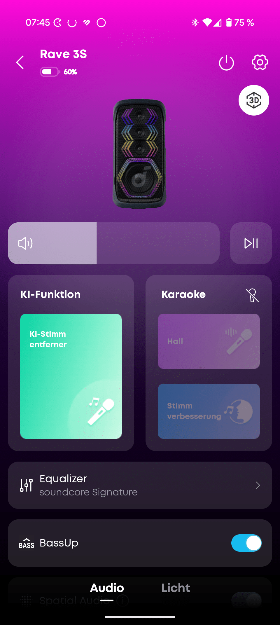 Für den vollen Funktionsumfang des Lautsprechers kommt die soundcore Smartphone-App zum Einsatz und die hat eine Menge zu bieten. Die wichtigsten Funktionen finden sich gleich auf der Hauptseite. Hier ist neben einer Anpassung der Lautstärke und Play/Pause auch die Einstellung der KI- und Karaoke-Funktionen möglich, während die die BassUp-Funktion ein- und ausschalten kannst. Außerdem aktivierst du hier Spatial-Audio, denn der soundcore Rave 3S beherrscht einen Raumklang, wenn er vertikal genutzt wird.