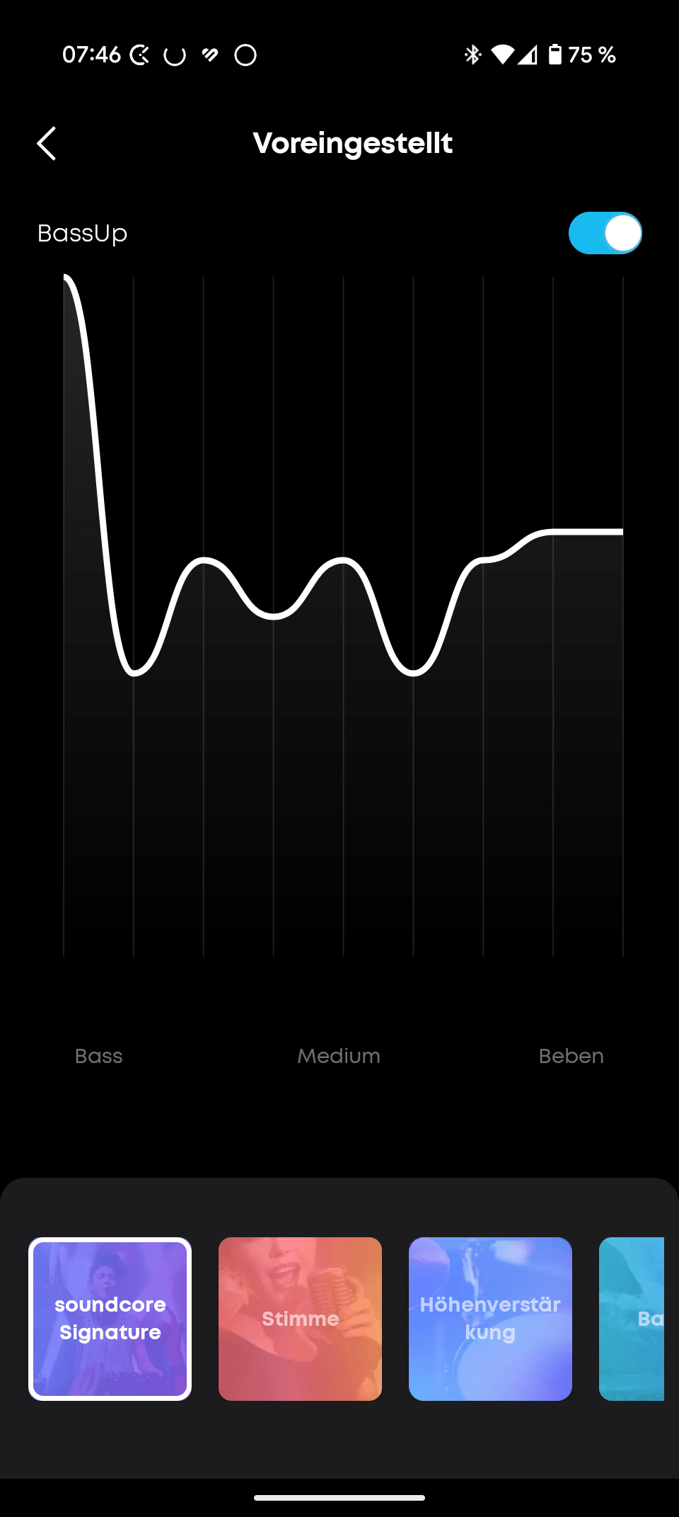 Über die Soundcore-App lässt sich der Klang des Rave 3S dank umfassender Equalizer-Einstellungen individuell anpassen. Dennoch überzeugt der Lautsprecher bereits im Auslieferungszustand klanglich – insbesondere, wenn BassUP aktiviert ist.