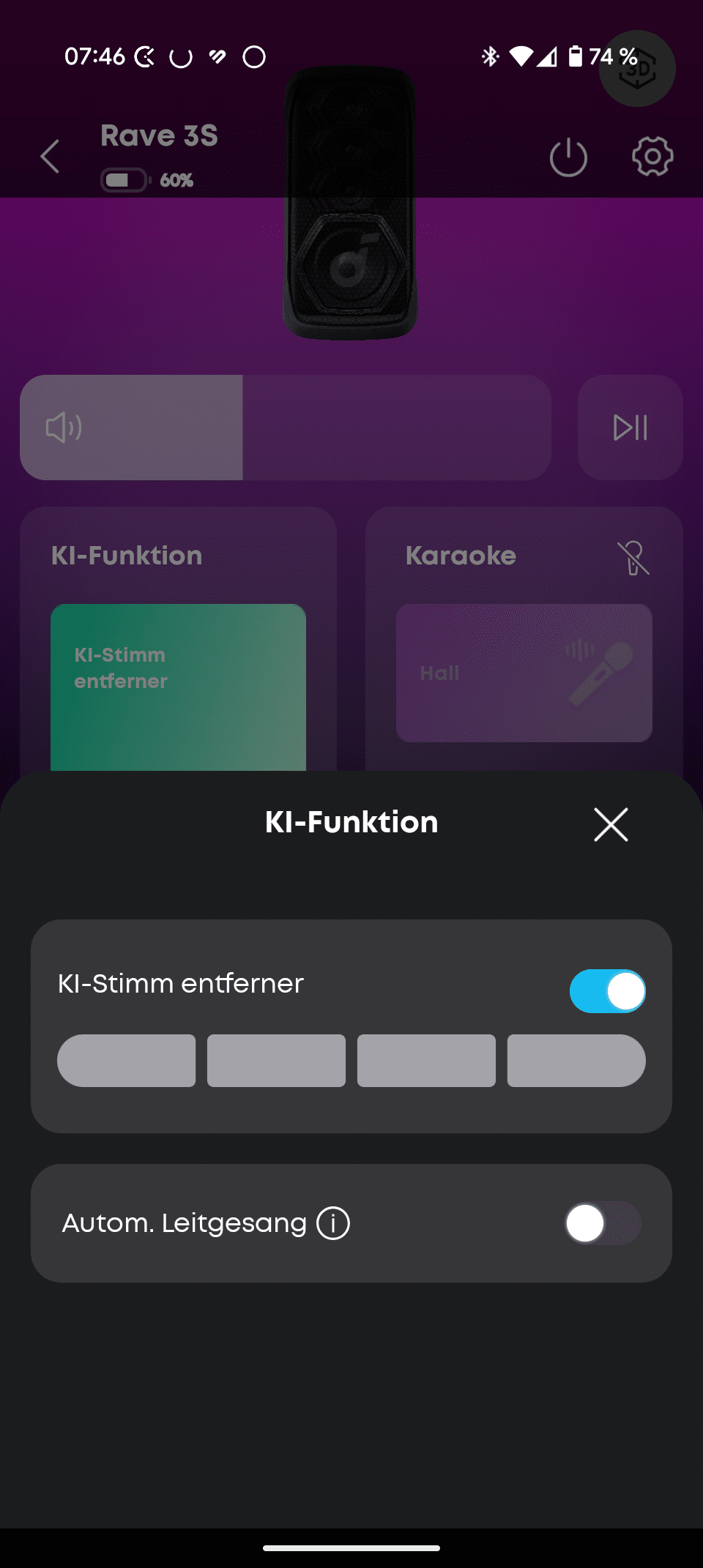 Besonders die KI-Funktionen sind dabei ein echter Gamechanger für Karaoke: „Gerade KI Voice Removal“ ermöglicht es, in insgesamt vier Stufen – wahlweise in der App oder über die KI-Taste an den Mikrofonen – den Gesang aus Songs zu entfernen oder ihn zumindest zu reduzieren.