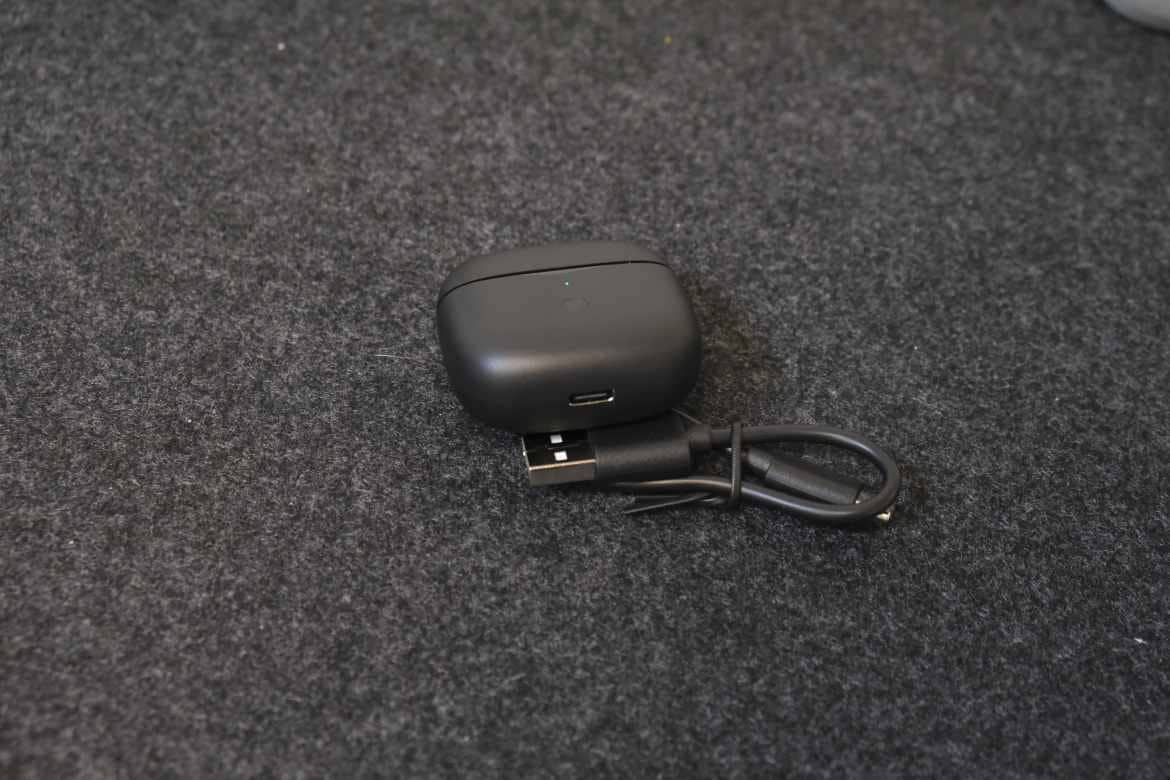 Es ist vollständig in mattem Schwarz gehalten, lediglich ein glänzend lackierter Ring unterhalb des Deckels sticht als Detail ins Auge. Unter dem Ring befindet sich eine Status-LED, die über den Ladezustand oder Pairing-Prozess informiert. Selbiger wird mithilfe des physischen Buttons angestoßen, der unterhalb der LED positioniert ist. An der Unterseite des Ladeetuis verbaut der Hersteller den USB-C-Eingang zum Laden, an der Oberseite ist der Name des Herstellers aufgedruckt.