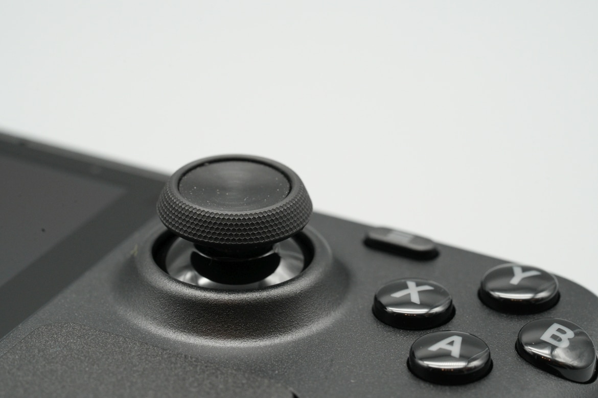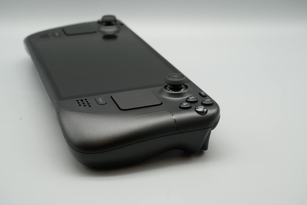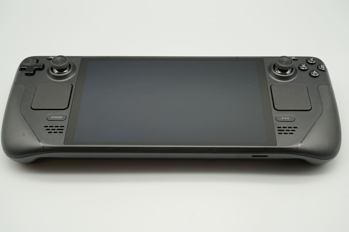 Noch immer wird die Frontpartie vom Display dominiert, das nun aber nicht nur auf die OLED-Technologie setzt, sondern auch von 7 Zoll auf 7,4 Zoll angewachsen ist. Es wird noch immer durch die beiden Analog-Sticks, Touchpads, Knöpfe und Lautsprecher angerahmt.