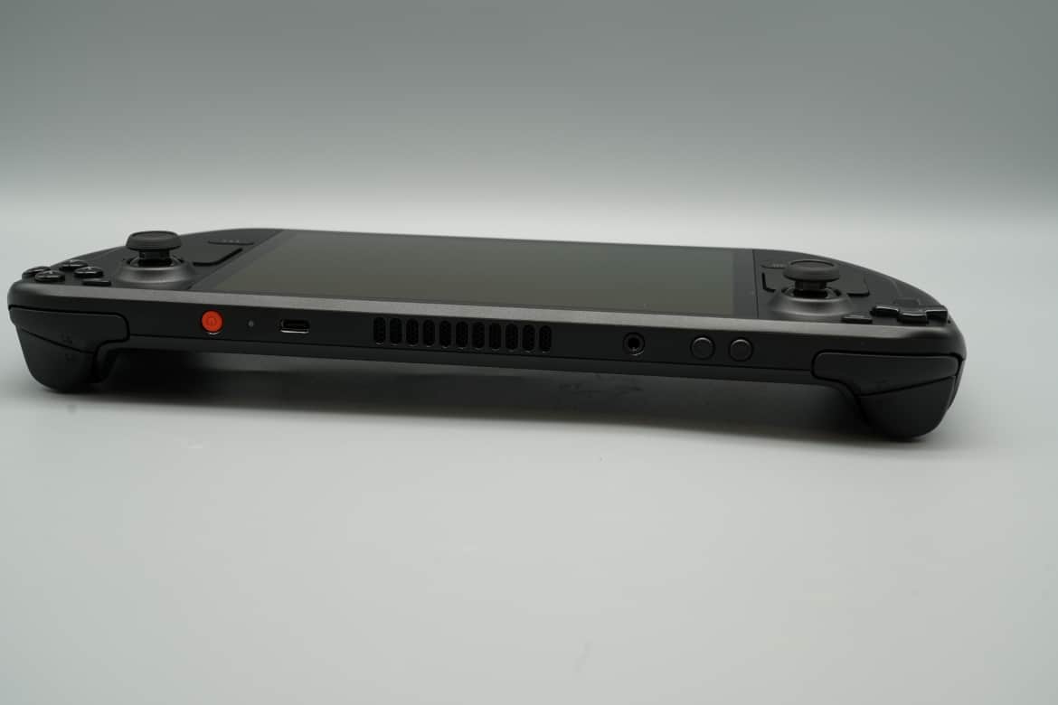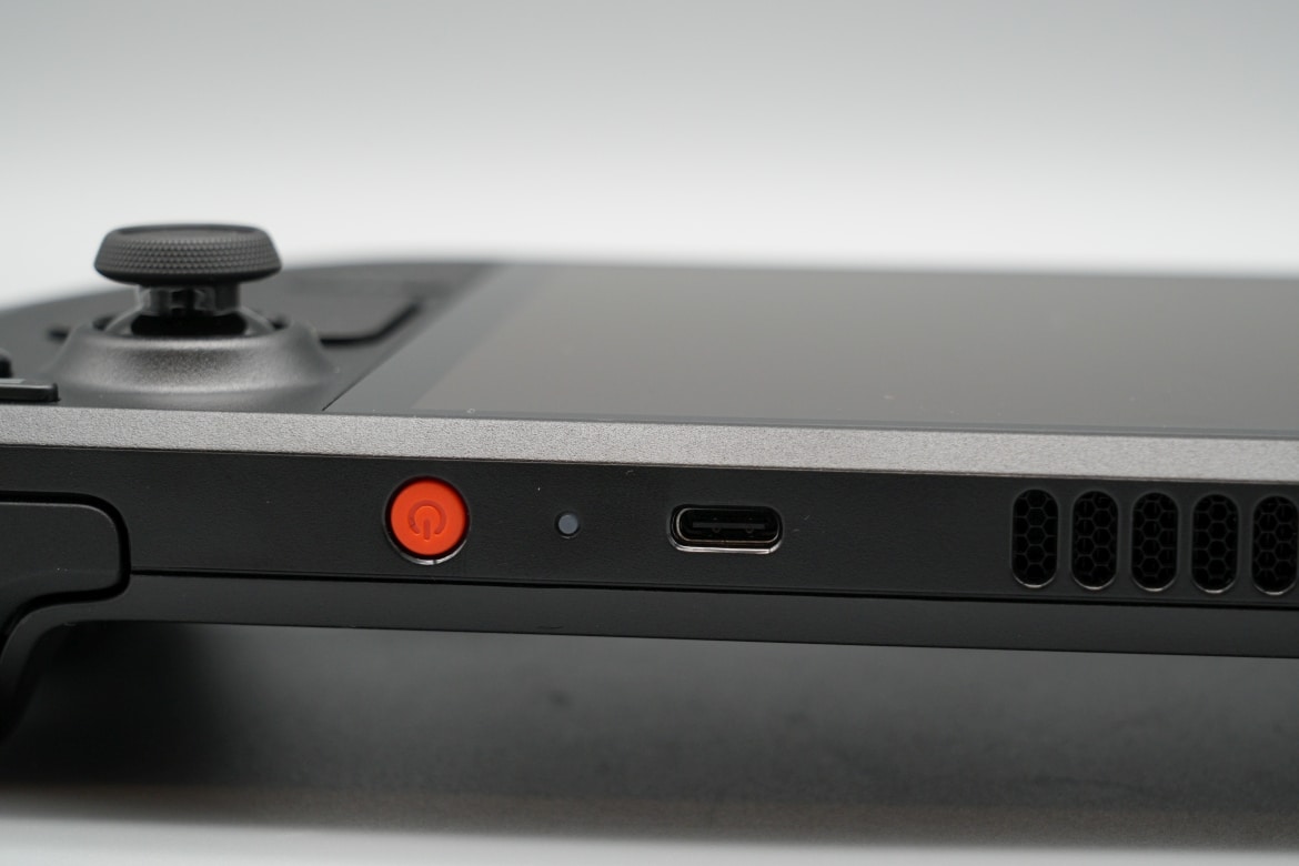 An der Oberseite hat der Power-Button nun eine orange Farbgebung spendiert bekommen, was das OLED-Modell von seinem Vorgänger unterscheidet. Hier finden wir zudem den USB-C-Port, Luftauslass, die 3,5-mm-Klinkenbuchse für Kopfhörer, die beiden Lautstärke-Buttons und die R1- und L1-Bumper sowie R2- und L2-Trigger.